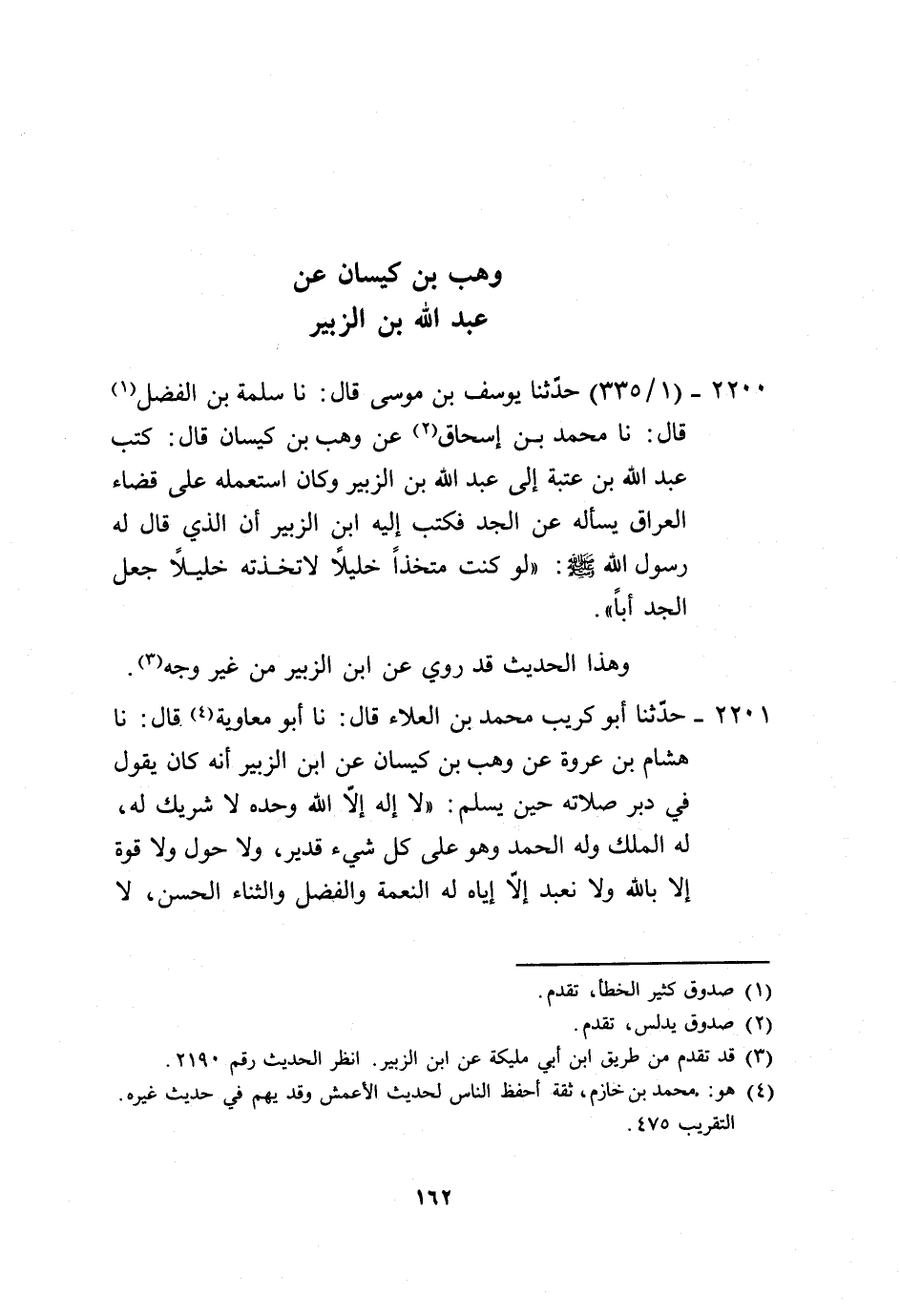 2201 - حَدَّثَنَا أَبُو كُرَيْبٍ مُحَمَّدُ بْنُ الْعَلَاءِ، قَالَ: نا أَبُو مُعَاوِيَةَ، قَالَ: نا هِشَامُ بْنُ عُرْوَةَ، عَنْ وَهْبِ بْنِ كَيْسَانَ، عَنِ ابْنِ الزُّبَيْرِ، أَنَّهُ كَانَ يَقُولُ فِي دُبُرِ صَلَاتِهِ حِينَ يُسَلِّمُ: «§لَا إِلَهَ إِلَّا اللَّهُ وَحْدَهُ لَا شَرِيكَ لَهُ، لَهُ الْمُلْكُ وَلَهُ الْحَمْدُ وَهُوَ عَلَى كُلِّ شَيْءٍ قَدِيرٌ، وَلَا حَوْلَ وَلَا قُوَّةَ إِلَّا بِاللَّهِ وَلَا نَعْبُدُ إِلَّا إِيَّاهُ لَهُ النِّعْمَةُ وَالْفَضْلُ وَالثَّنَاءُ الْحَسَنُ لَا -[163]- إِلَهَ إِلَّا هُوَ مُخْلِصِينَ لَهُ الدِّينَ وَلَوْ كَرِهَ الْمُشْرِكُونَ» ، قَالَ: وَكَانَ النَّبِيُّ صَلَّى اللهُ عَلَيْهِ وَسَلَّمَ يُهَلِّلُ بِهِنَّ فِي دُبُرِ كُلِّ صَلَاةٍ. وَهَذَا الْحَدِيثُ إِنَّمَا يُرْوَى عَنْ هِشَامٍ، عَنْ أَبِي الزُّبَيْرِ، مَوْلًى لِابْنِ الزُّبَيْرِ، عَنِ ابْنِ الزُّبَيْرِ. وَلَا نَعْلَمُ أَحَدًا رَوَاهُ عَنْ هِشَامٍ، عَنْ وَهْبٍ، عَنِ ابْنِ الزُّبَيْرِ إِلَّا أَبُو مُعَاوِيَةَ