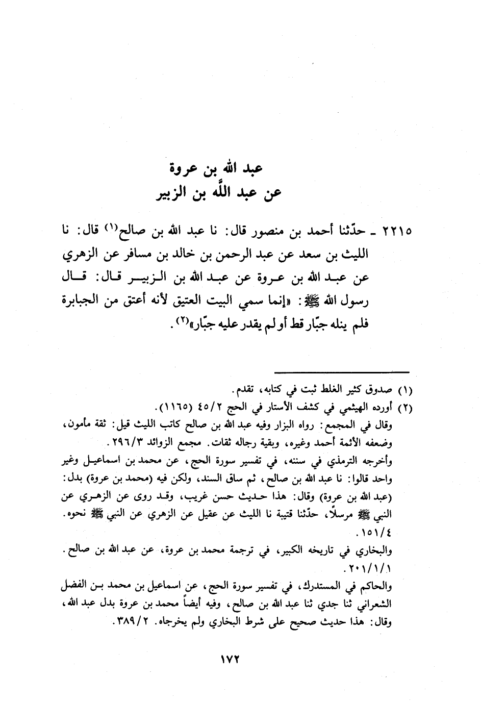 2215 - حَدَّثَنَا أَحْمَدُ بْنُ مَنْصُورٍ، قَالَ: نا عَبْدُ اللَّهِ بْنُ صَالِحٍ، قَالَ: نا اللَّيْثُ بْنُ سَعْدٍ، عَنْ عَبْدِ الرَّحْمَنِ بْنِ خَالِدِ بْنِ مُسَافِرٍ، عَنِ الزُّهْرِيِّ، عَنْ عَبْدِ اللَّهِ بْنِ عُرْوَةَ، عَنْ عَبْدِ اللَّهِ بْنِ الزُّبَيْرِ، قَالَ: قَالَ رَسُولُ اللَّهِ صَلَّى اللهُ عَلَيْهِ وَسَلَّمَ: «§إِنَّمَا سُمِّيَ الْبَيْتَ الْعَتِيقَ لِأَنَّهُ أُعْتِقَ مِنَ الْجَبَابِرَةِ، فَلَمْ يَنَلْهُ جُبَارٌ قَطُّ - أَوْ لَمْ يَقْدِرْ عَلَيْهِ جُبَارٌ» -[173]-. وَهَذَا الْحَدِيثُ لَا نَعْلَمُهُ يُرْوَى عَنِ النَّبِيِّ صَلَّى اللهُ عَلَيْهِ وَسَلَّمَ، إِلَّا عَنِ ابْنِ الزُّبَيْرِ عَنْهُ، وَلَا نَعْلَمُ لَهُ طَرِيقًا، عَنِ ابْنِ الزُّبَيْرِ إِلَّا هَذَا الطَّرِيقَ