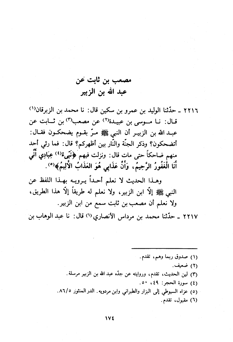2216 - حَدَّثَنَا الْوَلِيدُ بْنُ عَمْرِو بْنِ سُكَيْنٍ، قَالَ: نا مُحَمَّدُ بْنُ الزِّبْرِقَانِ، قَالَ: نا مُوسَى بْنُ عُبَيْدَةَ، عَنْ مُصْعَبِ بْنِ ثَابِتٍ، عَنْ عَبْدِ اللَّهِ بْنِ الزُّبَيْرِ، أَنَّ النَّبِيَّ صَلَّى اللهُ عَلَيْهِ وَسَلَّمَ مَرَّ بِقَوْمٍ يَضْحَكُونَ فَقَالَ: «أَتَضْحَكُونَ؟ وَذِكْرُ الْجَنَّةِ وَالنَّارِ بَيْنَ أَظْهُرِكُمْ؟» قَالَ: فَمَا رُئِيَ أَحَدٌ مِنْهُمْ ضَاحِكًا حَتَّى مَاتَ، قَالَ وَنَزَلَتْ فِيهِمْ {§نَبِّئْ عِبَادِي أَنِّي أَنَا الْغَفُورُ الرَّحِيمُ وَأَنَّ عَذَابِي هُوَ الْعَذَابُ الْأَلِيمُ} . وَهَذَا الْحَدِيثُ لَا نَعْلَمُ أَحَدًا يَرْوِيهِ بِهَذَا اللَّفْظِ، عَنِ النَّبِيِّ صَلَّى اللهُ عَلَيْهِ وَسَلَّمَ إِلَّا ابْنُ الزُّبَيْرِ، وَلَا نَعْلَمُ لَهُ طَرِيقًا إِلَّا هَذَا الطَّرِيقَ، وَلَا نَعْلَمُ أَنَّ مُصْعَبَ بْنَ ثَابِتٍ سَمِعَ مِنِ ابْنِ الزُّبَيْرِ