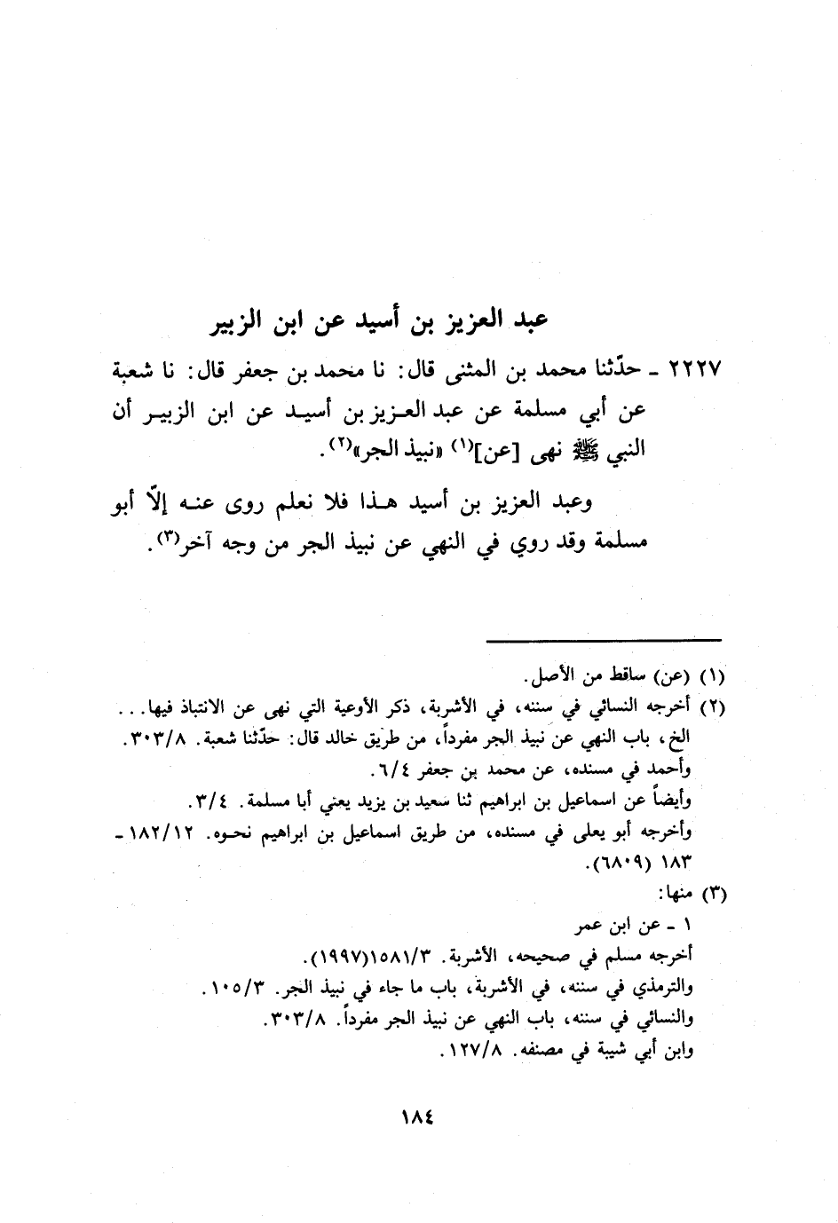 2227 - حَدَّثَنَا مُحَمَّدُ بْنُ الْمُثَنَّى، قَالَ: نا مُحَمَّدُ بْنُ جَعْفَرٍ، قَالَ: نا شُعْبَةُ، عَنْ أَبِي مَسْلَمَةَ، عَنْ عَبْدِ الْعَزِيزِ بْنِ أُسَيْدٍ، عَنِ ابْنِ الزُّبَيْرِ، «أَنَّ النَّبِيَّ صَلَّى اللهُ عَلَيْهِ وَسَلَّمَ §نَهَى عَنْ نَبِيذِ الْجَرِّ» . وَعَبْدُ الْعَزِيزِ بْنُ أُسَيْدٍ هَذَا فَلَا نَعْلَمُ رَوَى عَنْهُ إِلَّا أَبُو مَسْلَمَةَ وَقَدْ رُوِيَ فِي النَّهْيِ عَنْ نَبِيذِ الْجَرِّ، مِنْ وَجْهٍ آخَرَ