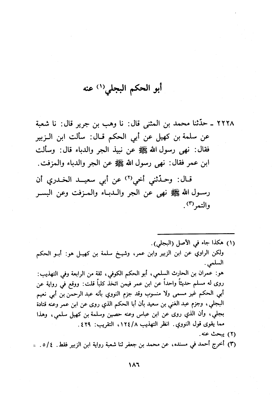 2228 - حَدَّثَنَا مُحَمَّدُ بْنُ الْمُثَنَّى، قَالَ: نا وَهْبُ بْنُ جَرِيرٍ، قَالَ: نا شُعْبَةُ، عَنْ سَلَمَةَ بْنِ كُهَيْلٍ، عَنْ أَبِي الْحَكَمِ، قَالَ: سَأَلْتُ ابْنَ الزُّبَيْرِ، فَقَالَ: «§نَهَى رَسُولُ اللَّهِ صَلَّى اللهُ عَلَيْهِ وَسَلَّمَ، عَنْ نَبِيذِ الْجَرِّ وَالدُّبَّاءِ»