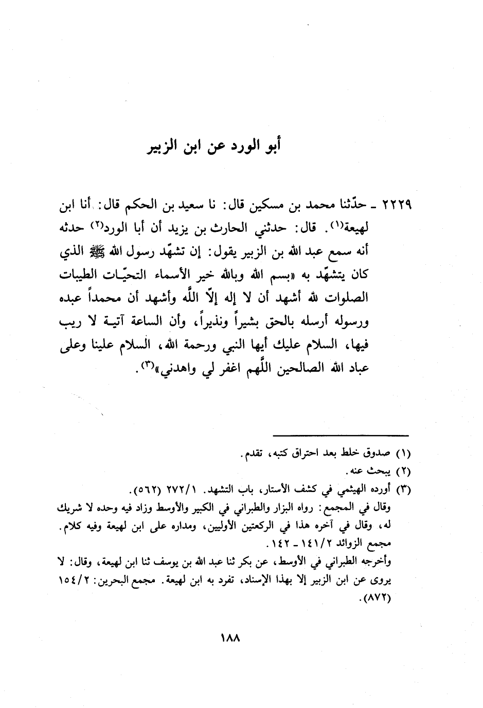 2229 - حَدَّثَنَا مُحَمَّدُ بْنُ مِسْكِينٍ، قَالَ: نا سَعِيدُ بْنُ الْحَكَمِ، قَالَ: أنا ابْنُ لَهِيعَةَ، قَالَ: حَدَّثَنِي الْحَارِثُ بْنُ يَزِيدَ، أَنَّ أَبَا الْوَرْدِ، حَدَّثَهُ أَنَّهُ، سَمِعَ عَبْدَ اللَّهِ بْنَ الزُّبَيْرِ، يَقُولُ: " إِنَّ تَشَهُّدَ رَسُولِ اللَّهِ صَلَّى اللهُ عَلَيْهِ وَسَلَّمَ الَّذِي كَانَ §يَتَشَهَّدُ بِهِ: بِسْمِ اللَّهِ، وَبِاللَّهِ خَيْرِ الْأَسْمَاءِ، التَّحِيَّاتُ الطَّيِّبَاتُ الصَّلَوَاتُ لِلَّهِ، أَشْهَدُ أَنْ لَا إِلَهَ إِلَّا اللَّهُ، وَأَشْهَدُ أَنَّ مُحَمَّدًا عَبْدُهُ وَرَسُولُهُ، أَرْسَلَهُ بِالْحَقِّ بَشِيرًا وَنَذِيرًا، وَأَنَّ السَّاعَةَ آتِيَةٌ لَا رَيْبَ فِيهَا، السَّلَامُ عَلَيْكَ أَيُّهَا النَّبِيُّ وَرَحْمَةُ اللَّهِ، السَّلَامُ عَلَيْنَا وَعَلَى عِبَادِ اللَّهِ الصَّالِحِينَ، اللَّهُمَّ اغْفِرْ لِي وَاهْدِنِي " -[189]-. وَهَذَا الْحَدِيثُ لَا نَعْلَمُهُ يُرْوَى بِهَذَا اللَّفْظِ فِي تَشَهُّدِ النَّبِيِّ صَلَّى اللهُ عَلَيْهِ وَسَلَّمَ، إِلَّا عَنِ ابْنِ الزُّبَيْرِ بِهَذَا الْإِسْنَادِ، وَأَبُو الْوَرْدِ فَلَا نَعْلَمُ رَوَى عَنْهُ إِلَّا الْحَارِثُ بْنُ يَزِيدَ، وَالْحَارِثُ بْنُ يَزِيدَ فَقَدْ رَوَى عَنْهُ ابْنُ لَهِيعَةَ وَغَيْرُهُ