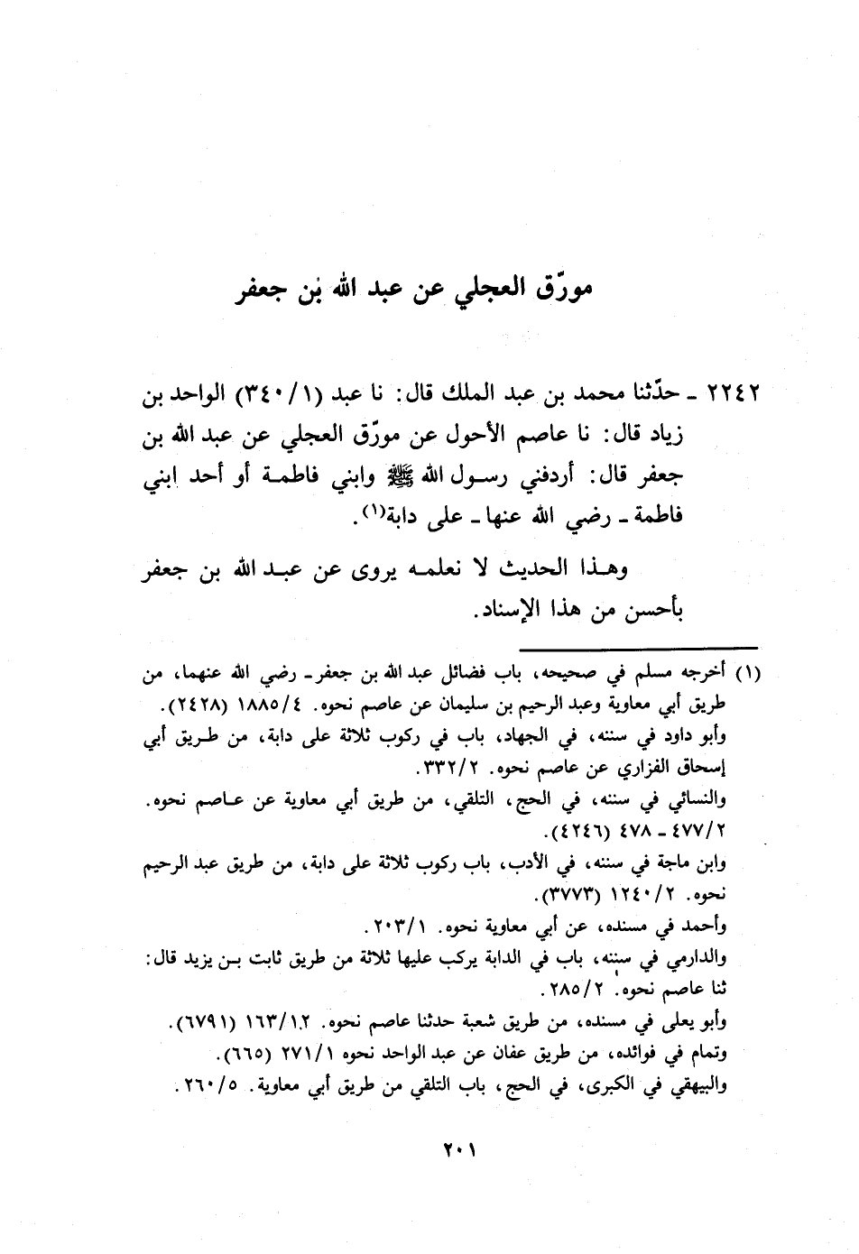 2242 - حَدَّثَنَا مُحَمَّدُ بْنُ عَبْدٍ الْمَلِكِ، قَالَ: نا عَبْدُ الْوَاحِدِ بْنُ زِيَادٍ، قَالَ: نا عَاصِمٌ الْأَحْوَلُ، عَنْ مُوَرِّقٍ الْعِجْلِيِّ، عَنْ عَبْدِ اللَّهِ بْنِ جَعْفَرٍ، قَالَ: «أَرْدَفَنِي رَسُولُ اللَّهِ صَلَّى اللهُ عَلَيْهِ وَسَلَّمَ، §وَابْنَيْ فَاطِمَةَ أَوْ أَحَدَ ابْنَيْ فَاطِمَةَ رَضِيَ اللَّهُ عَنْهَا عَلَى دَابَّةٍ» . وَهَذَا الْحَدِيثُ لَا نَعْلَمُهُ يُرْوَى عَنْ عَبْدِ اللَّهِ بْنِ جَعْفَرٍ بِأَحْسَنَ مِنْ هَذَا الْإِسْنَادِ