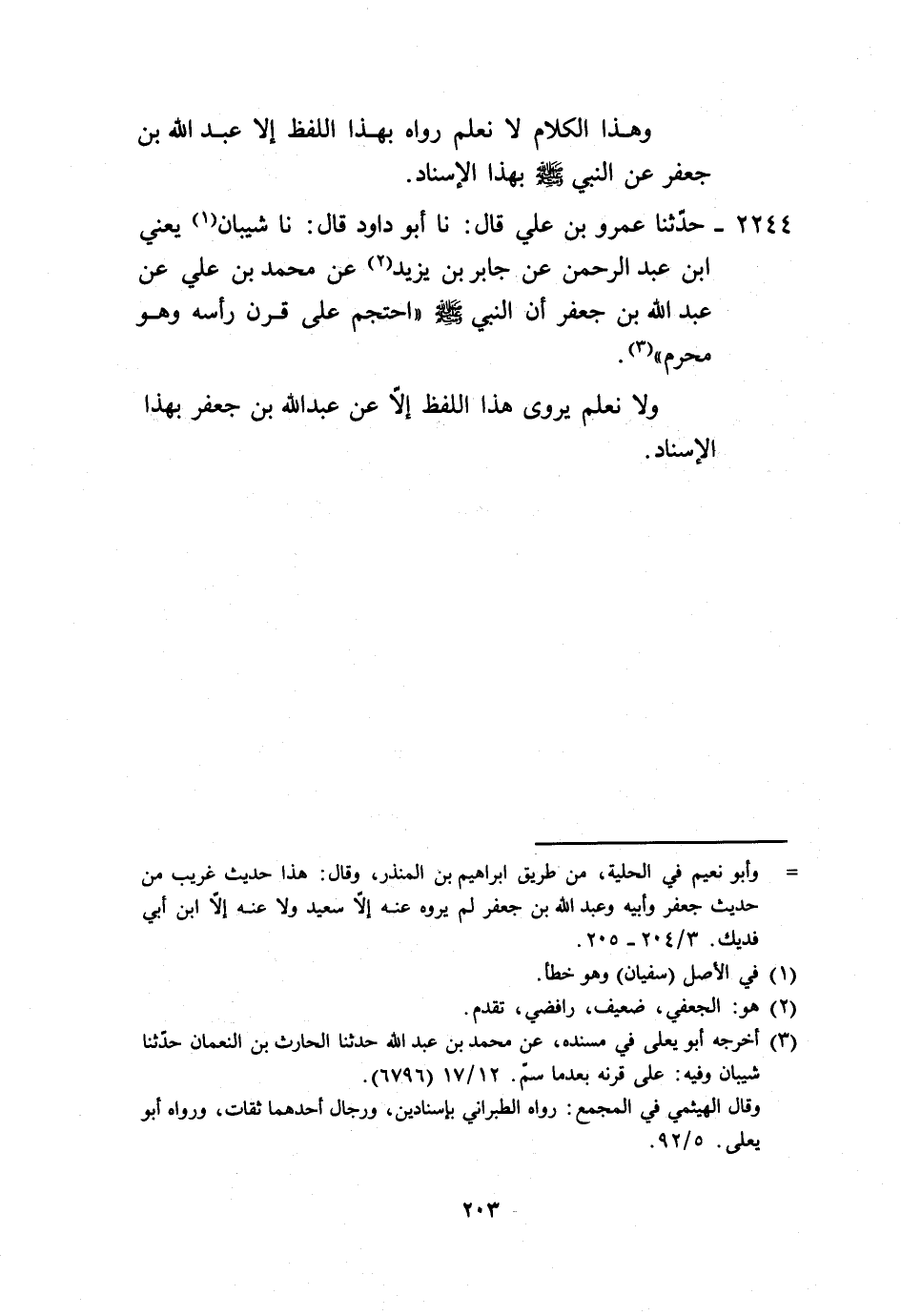 2244 - حَدَّثَنَا عَمْرُو بْنُ عَلِيٍّ، قَالَ: نا أَبُو دَاوُدَ، قَالَ: نا شَيْبَانُ يَعْنِي ابْنَ عَبْدِ الرَّحْمَنِ، عَنْ جَابِرِ بْنِ يَزِيدَ، عَنْ مُحَمَّدِ بْنِ عَلِيٍّ، عَنْ عَبْدِ اللَّهِ بْنِ جَعْفَرٍ، «أَنَّ النَّبِيَّ صَلَّى اللهُ عَلَيْهِ وَسَلَّمَ §احْتَجَمَ عَلَى قَرْنِ رَأْسِهِ وَهُوَ مُحْرِمٌ» . وَلَا نَعْلَمُ يُرْوَى هَذَا اللَّفْظُ إِلَّا عَنْ عَبْدِ اللَّهِ بْنِ جَعْفَرٍ بِهَذَا الْإِسْنَادِ