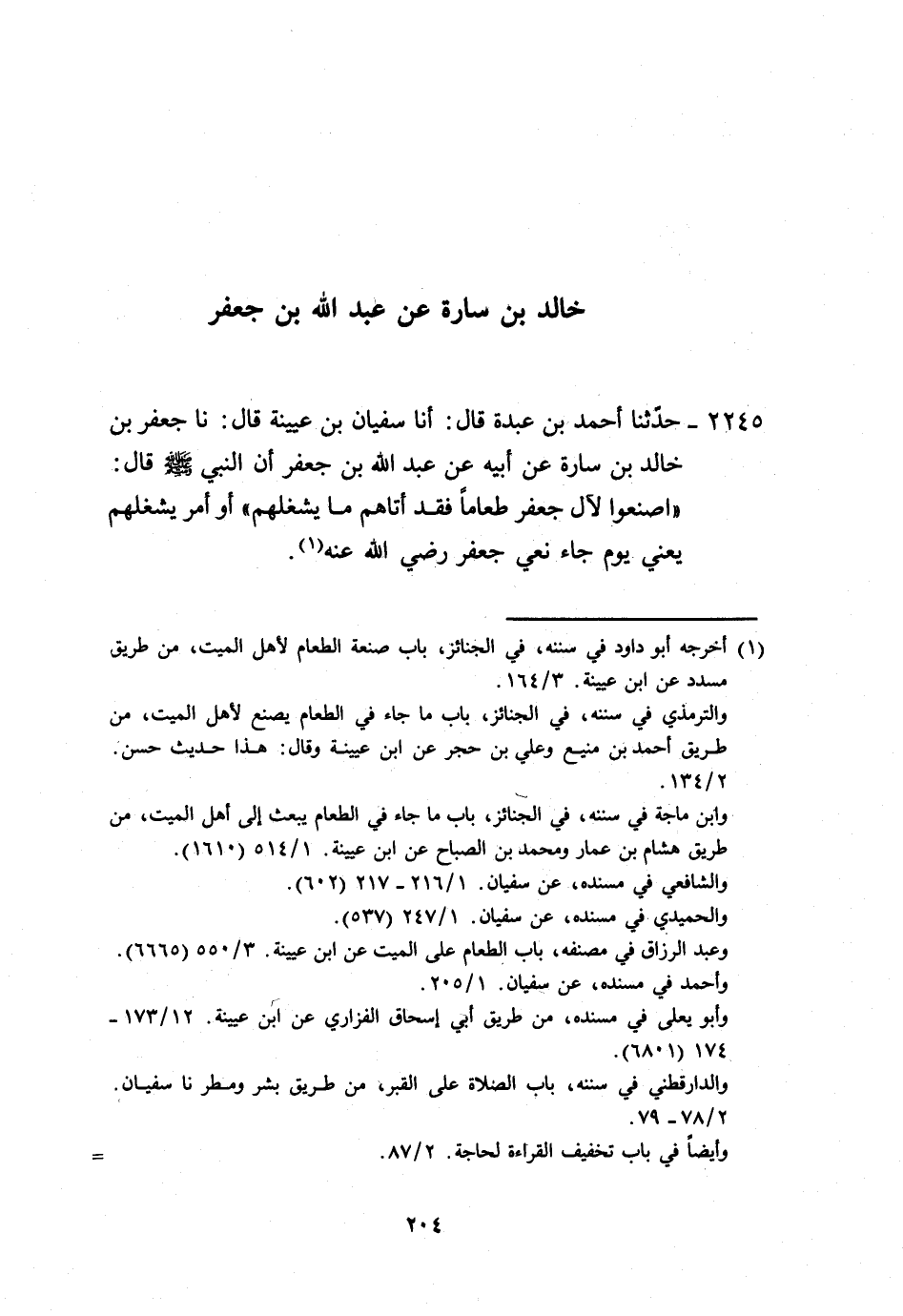 2245 - حَدَّثَنَا أَحْمَدُ بْنُ عَبْدَةَ، قَالَ: أنا سُفْيَانُ بْنُ عُيَيْنَةَ، قَالَ: نا جَعْفَرُ بْنُ خَالِدِ بْنِ سَارَةَ، عَنْ أَبِيهِ، عَنْ عَبْدِ اللَّهِ بْنِ جَعْفَرٍ، أَنَّ النَّبِيَّ صَلَّى اللهُ عَلَيْهِ وَسَلَّمَ قَالَ: «§اصْنَعُوا لِآلِ جَعْفَرٍ طَعَامًا فَقَدْ أَتَاهُمْ مَا يَشْغَلُهُمْ - أَوْ أَمْرٌ يَشْغَلُهُمْ - يَعْنِي يَوْمَ جَاءَ نَعْيُ جَعْفَرٍ رَضِيَ اللَّهُ عَنْهُ»