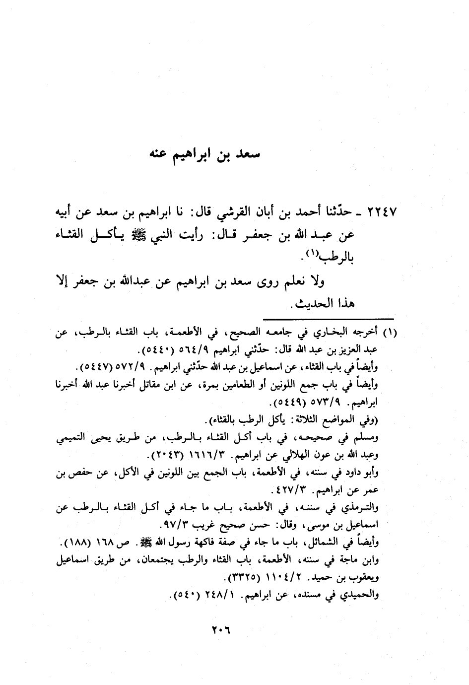 2247 - حَدَّثَنَا أَحْمَدُ بْنُ أَبَانَ الْقُرَشِيُّ، قَالَ: نا إِبْرَاهِيمُ بْنُ سَعْدٍ، عَنْ أَبِيهِ، عَنْ عَبْدِ اللَّهِ بْنِ جَعْفَرٍ، قَالَ: «رَأَيْتُ النَّبِيَّ §يَأْكُلُ الْقِثَّاءَ بِالرُّطَبِ» . وَلَا نَعْلَمُ رَوَى سَعْدُ بْنُ إِبْرَاهِيمَ، عَنْ عَبْدِ اللَّهِ بْنِ جَعْفَرٍ إِلَّا هَذَا الْحَدِيثَ
