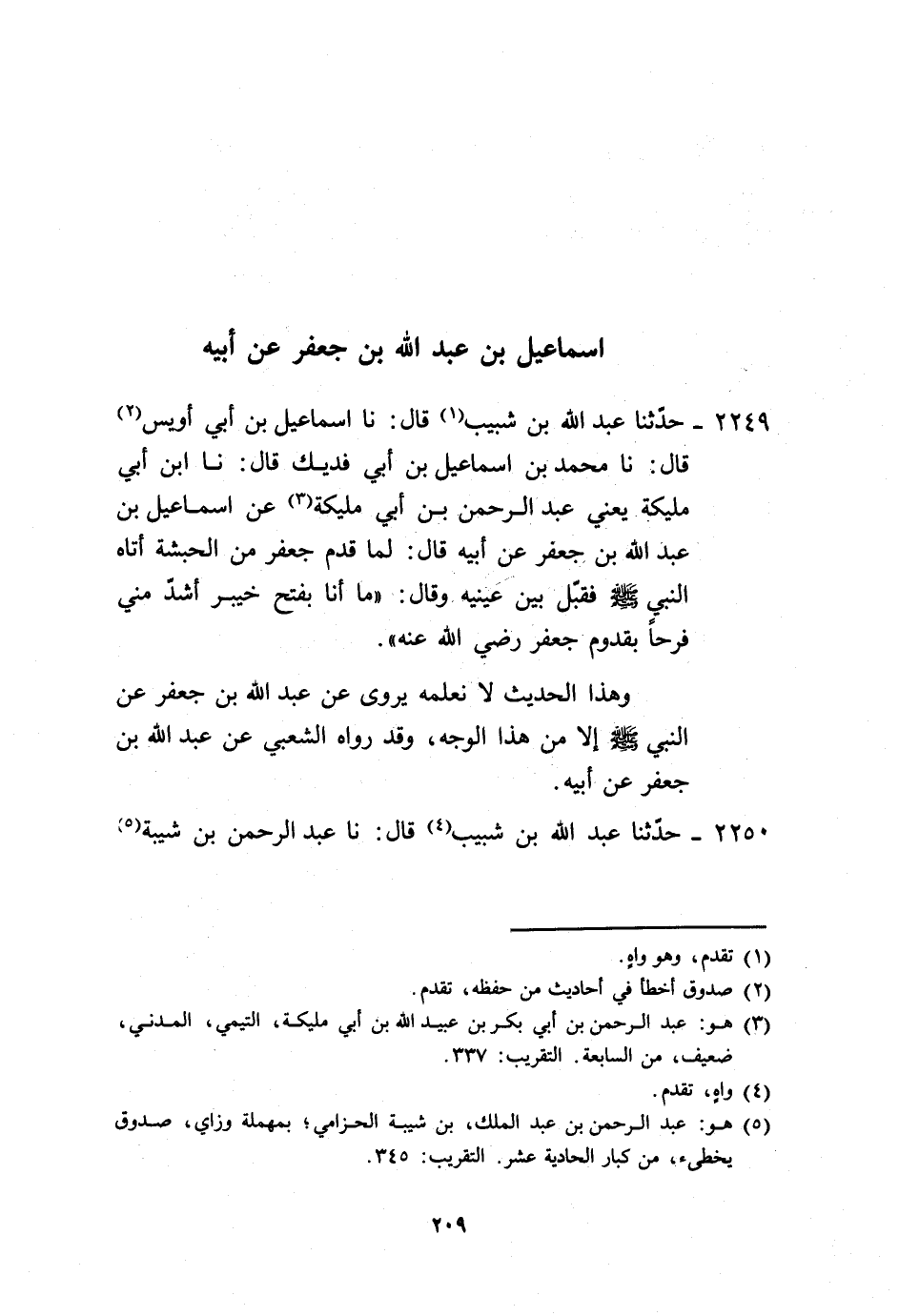 2249 - حَدَّثَنَا عَبْدُ اللَّهِ بْنُ شَبِيبٍ، قَالَ: نا إِسْمَاعِيلُ بْنُ أَبِي أُوَيْسٍ، قَالَ: نا مُحَمَّدُ بْنُ إِسْمَاعِيلَ بْنِ أَبِي فُدَيْكٍ، قَالَ: نا ابْنُ أَبِي مُلَيْكَةَ يَعْنِي عَبْدَ الرَّحْمَنِ بْنَ أَبِي مُلَيْكَةَ، عَنْ إِسْمَاعِيلَ بْنِ عَبْدِ اللَّهِ بْنِ جَعْفَرٍ، عَنْ أَبِيهِ، قَالَ: لَمَّا قَدِمَ جَعْفَرٌ مِنَ الْحَبَشَةِ أَتَاهُ النَّبِيُّ صَلَّى اللهُ عَلَيْهِ وَسَلَّمَ فَقَبَّلَ بَيْنَ عَيْنَيْهِ وَقَالَ: «§مَا أَنَا بِفَتْحِ خَيْبَرَ أَشَدُّ مِنِّي فَرَحًا بِقُدُومِ جَعْفَرٍ رَضِيَ اللَّهُ عَنْهُ» . وَهَذَا الْحَدِيثُ لَا نَعْلَمُهُ يُرْوَى عَنْ عَبْدِ اللَّهِ بْنِ جَعْفَرٍ، عَنِ النَّبِيِّ صَلَّى اللهُ عَلَيْهِ وَسَلَّمَ إِلَّا مِنْ هَذَا الْوَجْهِ. وَقَدْ رَوَاهُ الشَّعْبِيُّ، عَنْ عَبْدِ اللَّهِ بْنِ جَعْفَرٍ، عَنْ أَبِيهِ