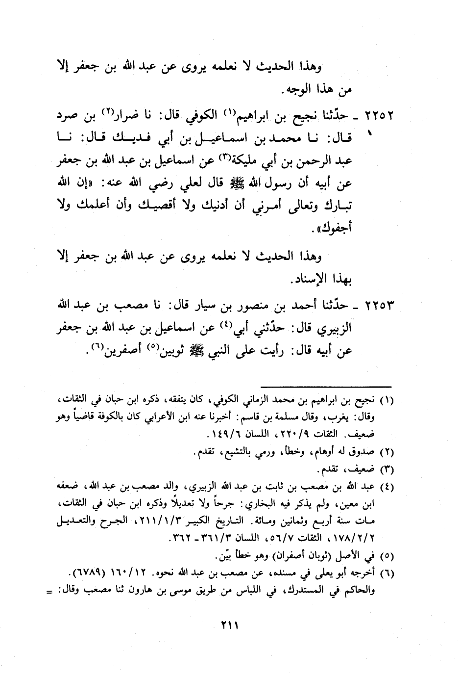 2253 - حَدَّثَنَا أَحْمَدُ بْنُ مَنْصُورِ بْنِ سَيَّارٍ، قَالَ: نا مُصْعَبُ بْنُ عَبْدِ اللَّهِ الزُّبَيْرِيُّ، قَالَ: حَدَّثَنِي أَبِي، عَنْ إِسْمَاعِيلَ بْنِ عَبْدِ اللَّهِ بْنِ جَعْفَرٍ، عَنْ أَبِيهِ، قَالَ: «رَأَيْتُ §عَلَى النَّبِيِّ صَلَّى اللهُ عَلَيْهِ وَسَلَّمَ ثَوْبَيْنِ أَصْفرَيْنِ» -[212]-. وَهَذَا الْحَدِيثُ لَا نَعْلَمُهُ يُرْوَى، عَنْ عَبْدِ اللَّهِ بْنِ جَعْفَرٍ إِلَّا بِهَذَا الْإِسْنَادِ