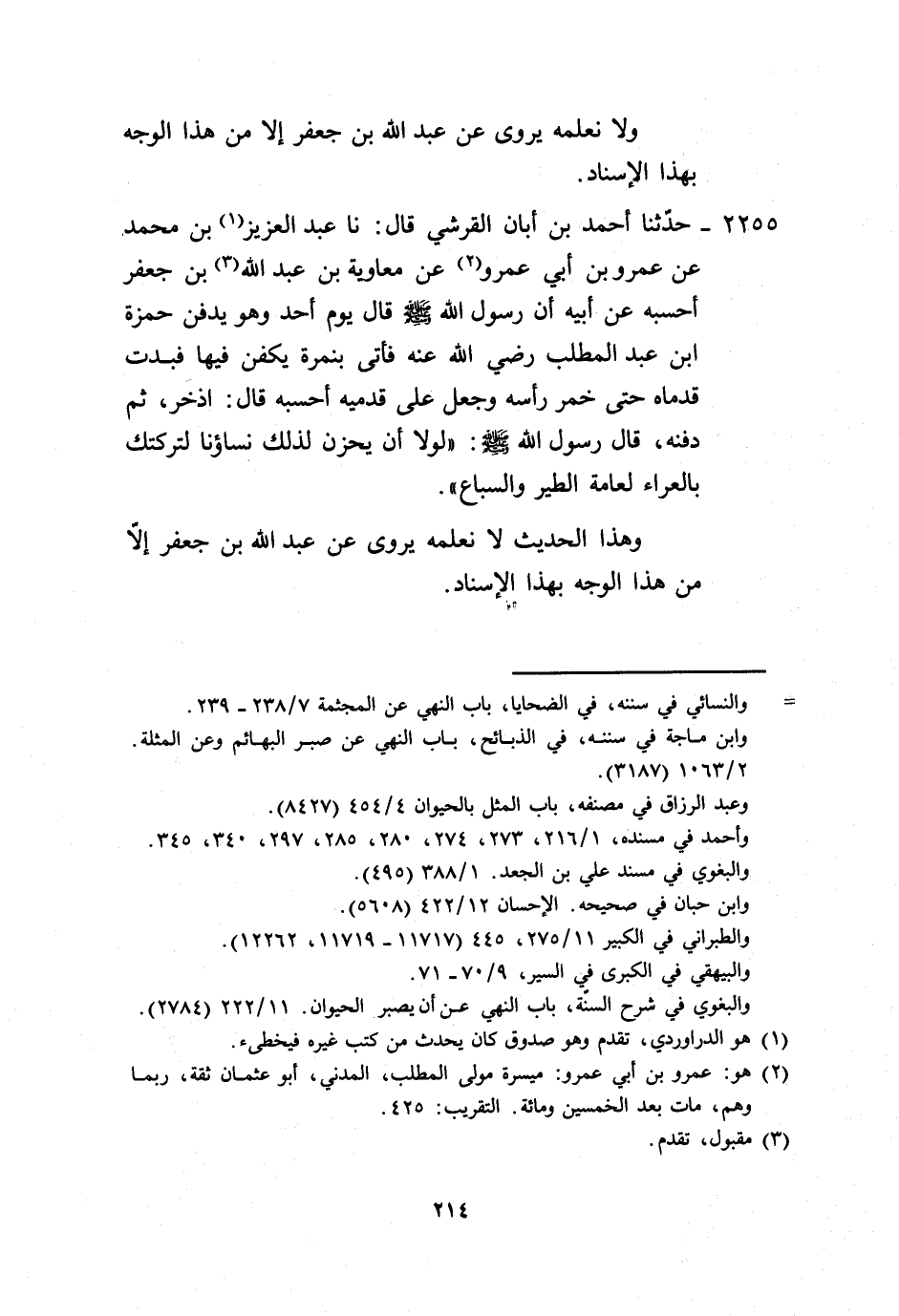 2255 - حَدَّثَنَا أَحْمَدُ بْنُ أَبَانَ الْقُرَشِيُّ، قَالَ: نا عَبْدُ الْعَزِيزِ بْنُ مُحَمَّدٍ، عَنِ عَمْرُو بْنِ أَبِي عَمْرٍو، عَنْ مُعَاوِيَةَ بْنِ عَبْدِ اللَّهِ بْنِ جَعْفَرٍ، أَحْسِبُهُ عَنْ أَبِيهِ، أَنَّ رَسُولَ اللَّهِ صَلَّى اللهُ عَلَيْهِ وَسَلَّمَ قَالَ يَوْمَ أَحَدٍ - وَهُوَ يَدْفِنُ حَمْزَةَ بْنَ عَبْدِ الْمُطَّلِبٍ رَضِيَ اللَّهُ عَنْهُ - فَأُتِيَ بِنَمِرَةٍ يُكَفَّنُ فِيهَا فَبَدَتْ قَدَمَاهُ حَتَّى خَمَّرَ رَأْسَهُ وَجَعَلَ عَلَى قَدَمَيْهِ - أَحْسِبُهُ قَالَ إِذْخِرًا - ثُمَّ دَفْنَهُ، قَالَ رَسُولُ اللَّهِ صَلَّى اللهُ عَلَيْهِ وَسَلَّمَ: «§لَوْلَا أَنْ يَحْزَنَ لِذَلِكَ نِسَاؤُنَا لَتَرَكْتُكَ بِالْعَرَاءِ لِعَامَّةِ الطَّيْرِ وَالسِّبَاعِ» . وَهَذَا الْحَدِيثُ لَا نَعْلَمُهُ يُرْوَى عَنْ عَبْدِ اللَّهِ بْنِ جَعْفَرٍ إِلَّا مِنْ هَذَا الْوَجْهِ بِهَذَا الْإِسْنَادِ