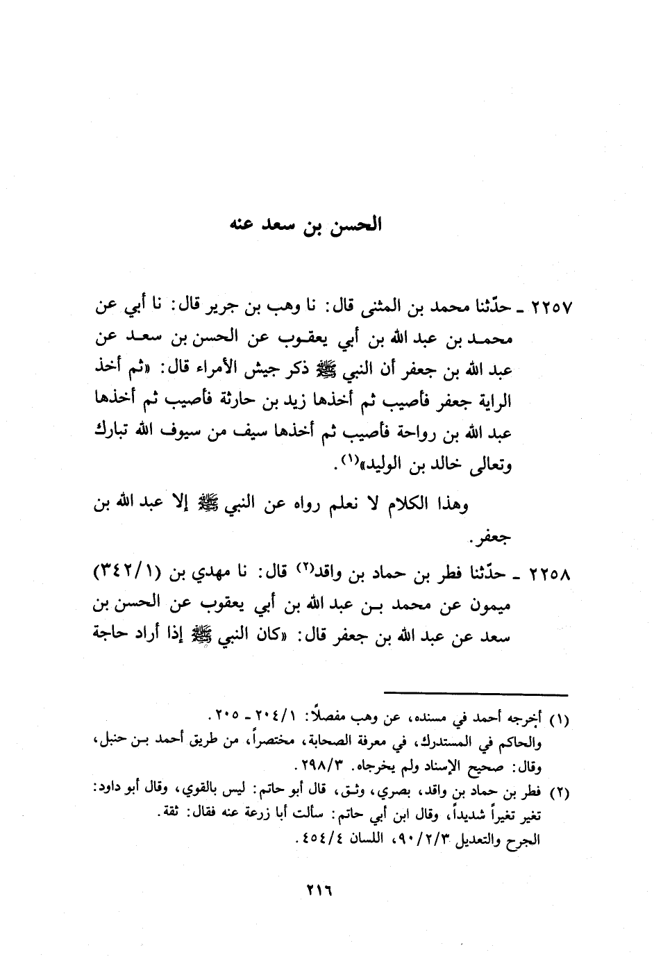 2257 - حَدَّثَنَا مُحَمَّدُ بْنُ الْمُثَنَّى، قَالَ: نا وَهْبُ بْنُ جَرِيرٍ، قَالَ: نا أَبِي، عَنْ مُحَمَّدِ بْنِ عَبْدِ اللَّهِ بْنِ أَبِي يَعْقُوبَ، عَنِ الْحَسَنِ بْنِ سَعْدٍ، عَنْ عَبْدِ اللَّهِ بْنِ جَعْفَرٍ، أَنَّ النَّبِيَّ صَلَّى اللهُ عَلَيْهِ وَسَلَّمَ ذَكَرَ جَيْشَ الْأُمَرَاءِ قَالَ: «ثُمَّ §أَخَذَ الرَّايَةَ جَعْفَرٌ فَأُصِيبَ، ثُمَّ أَخَذَهَا زَيْدُ بْنُ حَارِثَةَ فَأُصِيبَ، ثُمَّ أَخَذَهَا عَبْدُ اللَّهِ بْنُ رَوَاحَةَ فَأُصِيبَ، ثُمَّ أَخَذَهَا سَيْفٌ مِنْ سُيُوفِ اللَّهِ تَبَارَكَ وَتَعَالَى خَالِدُ بْنُ الْوَلِيدِ» . وَهَذَا الْكَلَامُ لَا نَعْلَمُ رَوَاهُ عَنِ النَّبِيِّ صَلَّى اللهُ عَلَيْهِ وَسَلَّمَ إِلَّا عَبْدُ اللَّهِ بْنُ جَعْفَرٍ