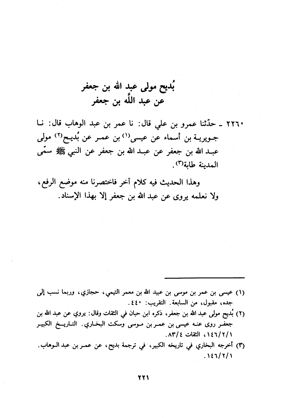 2260 - حَدَّثَنَا عَمْرُو بْنُ عَلِيٍّ، قَالَ: نا عُمَرُ بْنُ عَبْدِ الْوَهَّابِ، قَالَ: نا جُوَيْرِيَةُ بْنُ أَسْمَاءَ، عَنْ عِيسَى بْنِ عُمَرَ، عَنْ بُدَيْحٍ، مَوْلَى عَبْدِ اللَّهِ بْنِ جَعْفَرٍ، عَنْ عَبْدِ اللَّهِ بْنِ جَعْفَرٍ، عَنِ النَّبِيِّ صَلَّى اللهُ عَلَيْهِ وَسَلَّمَ «§سَمَّى الْمَدِينَةَ طَابَةَ» . وَهَذَا الْحَدِيثُ فِيهِ كَلَامٌ آخَرُ، فَاخْتَصَرْنَا مِنْهُ مَوْضِعَ الرَّفْعِ، وَلَا نَعْلَمُهُ يُرْوَى، عَنْ عَبْدِ اللَّهِ بْنِ جَعْفَرٍ إِلَّا بِهَذَا الْإِسْنَادِ