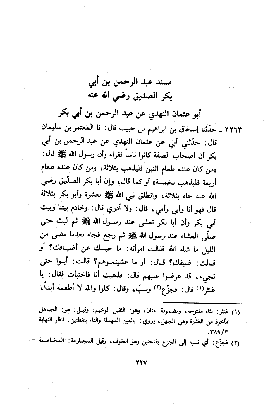 2263 - حَدَّثَنَا إِسْحَاقُ بْنُ إِبْرَاهِيمَ بْنِ حَبِيبٍ، قَالَ: نا الْمُعْتَمِرُ بْنُ سُلَيْمَانَ، قَالَ: حَدَّثَنِي أَبِي عَنْ أَبِي عُثْمَانَ النَّهْدِيِّ، عَنْ عَبْدِ الرَّحْمَنِ بْنِ أَبِي بَكْرٍ، أَنَّ أَصْحَابَ الصُّفَّةِ، كَانُوا نَاسًا فُقَرَاءَ وَأَنَّ رَسُولَ اللَّهِ صَلَّى اللهُ عَلَيْهِ وَسَلَّمَ قَالَ: «§مَنْ كَانَ عِنْدَهُ طَعَامُ اثْنَيْنِ فَلْيَذْهَبْ بِثَلَاثَةٍ، وَمَنْ كَانَ عِنْدَهُ طَعَامُ أَرْبَعَةٍ فَلْيَذْهَبْ بِخَمْسَةٍ» أَوْ كَمَا قَالَ: وَأَنَّ أَبَا بَكْرٍ الصِّدِّيقَ رَضِيَ اللَّهُ عَنْهُ، جَاءَ بِثَلَاثَةٍ وَانْطَلَقَ نَبِيُّ اللَّهِ بِعَشَرَةٍ، وَأَبُو بَكْرٍ بِثَلَاثَةٍ، قَالَ: فَهُوَ أَنَا وَأَبِي وَأُمِّي، قَالَ: وَلَا أَدْرِي، قَالَ: وَخَادِمُ بَيْتِنَا وَبَيْتِ أَبِي بَكْرٍ، وَأَنَّ أَبَا بَكْرٍ تَعَشَّى عِنْدَ رَسُولِ اللَّهِ صَلَّى اللهُ عَلَيْهِ وَسَلَّمَ، ثُمَّ لَبِثَ حَتَّى صَلَّى الْعِشَاءَ عِنْدَ رَسُولِ اللَّهِ صَلَّى اللهُ عَلَيْهِ وَسَلَّمَ، ثُمَّ رَجَعَ فَجَاءَ بَعْدَمَا مَضَى مِنَ اللَّيْلِ مَا شَاءَ اللَّهُ، فَقَالَتِ امْرَأَتُهُ: مَا حَبَسَكَ عَنْ أَضْيَافِكَ أَوْ قَالَتْ ضَيْفِكَ؟ قَالَ: أَوَ مَا عَشَّيْتُمُوهُمْ؟ قَالَتْ: أَبَوْا حَتَّى تَجِيءَ قَدْ عَرَضُوا عَلَيْهِمْ، قَالَ: فَذَهَبْتُ أَنَا فَاخْتَبَأْتُ، فَقَالَ: يَا غُنْثَرُ، قَالَ: فَجَزَّعَ وَسَبَّ، وَقَالَ: كُلُوا وَاللَّهِ لَا أَطْعَمُهُ أَبَدًا -[228]-، قَالُوا: فَأَيْمُ اللَّهِ مَا كُنَّا لِنَأْكُلَ حَتَّى تَأْكُلَ، قَالَ: فَأَخَذَ، فَأَيْمُ اللَّهِ مَا كُنَّا لِنَأْخُذَ مِنْ لُقْمَةَ إِلَّا رَبَا مِنْ أَسْفَلِهَا، قَالَ: فَشَبِعْنَا وَصَارَ أَكْثَرَ مِمَّا كَانَ قَبْلَ ذَلِكَ، فَنَظَرَ إِلَيْهَا أَبُو بَكْرٍ رَضِيَ اللَّهُ عَنْهُ، فَإِذَا هِيَ كَمَا هِيَ أَوْ أَكْثَرُ، فَقَالَ لِأُمِّهِ: يَا أُخْتَ بَنِي فِرَاسٍ، مَا هَذَا؟ قَالَتْ: لَا وَقُرَّةُ عَيْنِي لَهِيَ أَكْثَرُ مِنْهَا قَبْلَ ذَلِكَ بِثَلَاثِ مَرَّاتٍ، وَأَكَلَ مِنْهَا أَبُو بَكْرٍ رَضِيَ اللَّهُ عَنْهُ، وَقَالَ: كَانَ ذَلِكَ مِنَ الشَّيْطَانِ - يَعْنِي يَمِينَهُ - ثُمَّ أَكَلَ مِنْهَا لُقْمَةً، ثُمَّ حَمَلَهَا إِلَى رَسُولِ اللَّهِ صَلَّى اللهُ عَلَيْهِ وَسَلَّمَ فَأَصْبَحَتْ عِنْدَهُ، قَالَ: وَكَانَ بَيْنَنَا وَبَيْنَ قَوْمٍ عَقْدٌ فَمَضَى الْأَجَلُ فَفَرَّقْنَا اثْنَا عَشَرَ رَجُلًا مَعَ كُلِّ رَجُلٍ مِنْهُمْ، اللَّهُ أَعْلَمُ كَمْ تَبِعَ كُلُّ رَجُلٍ مِنْهُمْ غَيْرَ أَنَّهُ يُعِدُّ فَأَكَلُوا أَجْمَعِينَ -[229]-. وَهَذَا الْحَدِيثُ لَا نَعْلَمُ أَحَدًا يَرْوِيهِ إِلَّا عَبْدُ الرَّحْمَنِ بْنُ أَبِي بَكْرٍ، وَهَذَا الْإِسْنَادُ مِنْ أَحْسَنِ إِسْنَادٍ يُرْوَى فِي ذَلِكَ عَنْ عَبْدِ الرَّحْمَنِ