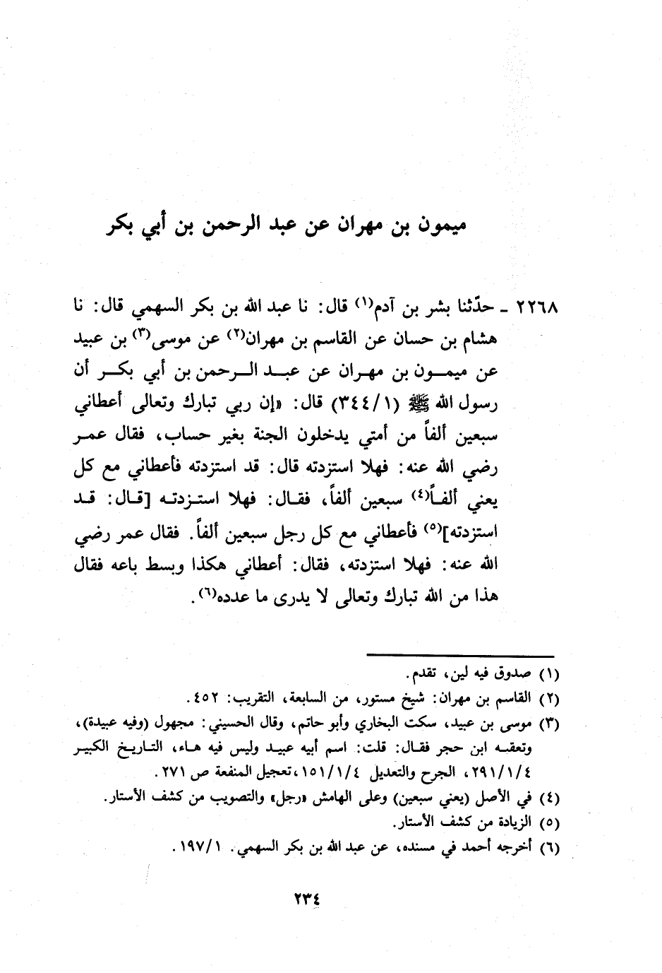 2268 - حَدَّثَنَا بِشْرُ بْنُ آدَمَ، قَالَ: نا عَبْدُ اللَّهِ بْنُ بَكْرٍ السَّهْمِيُّ، قَالَ: نا هِشَامُ بْنُ حَسَّانَ، عَنِ الْقَاسِمِ بْنِ مِهْرَانَ، عَنْ مُوسَى بْنِ عُبَيْدٍ، عَنْ مَيْمُونِ بْنِ مِهْرَانَ، عَنْ عَبْدِ الرَّحْمَنِ بْنِ أَبِي بَكْرٍ، أَنَّ رَسُولَ اللَّهِ صَلَّى اللهُ عَلَيْهِ وَسَلَّمَ، قَالَ: «إِنَّ §رَبِّي تَبَارَكَ وَتَعَالَى أَعْطَانِي سَبْعِينَ أَلْفًا مِنْ أُمَّتِي يَدْخُلُونَ الْجَنَّةَ بِغَيْرِ حِسَابٍ» فَقَالَ عُمَرُ رَضِيَ اللَّهُ عَنْهُ: فَهَلَّا اسْتَزَدْتَهُ؟ قَالَ: «قَدِ اسْتَزَدْتُهُ فَأَعْطَانِي مَعَ كُلٍّ - يَعْنِي أَلْفًا - سَبْعِينَ أَلْفًا» فَقَالَ: فَهَلَّا اسْتَزَدْتَهُ؟ قَالَ: «قَدِ اسْتَزَدْتُهُ فَأَعْطَانِي مَعَ كُلِّ رَجُلٍ سَبْعِينَ أَلْفًا» فَقَالَ عُمَرُ رَضِيَ اللَّهُ عَنْهُ: فَهَلَّا اسْتَزَدْتَهُ، فَقَالَ: «أَعْطَانِي هَكَذَا» وَبَسَطَ بَاعَهُ، فَقَالَ: «هَذَا مِنَ اللَّهِ تَبَارَكَ وَتَعَالَى لَا يُدْرَى مَا عَدَدُهُ» -[235]-. وَهَذَا الْكَلَامُ لَا نَعْلَمُهُ يُرْوَى، عَنْ عَبْدِ الرَّحْمَنِ بْنِ أَبِي بَكْرٍ إِلَّا مِنْ هَذَا الْوَجْهِ بِهَذَا الْإِسْنَادِ