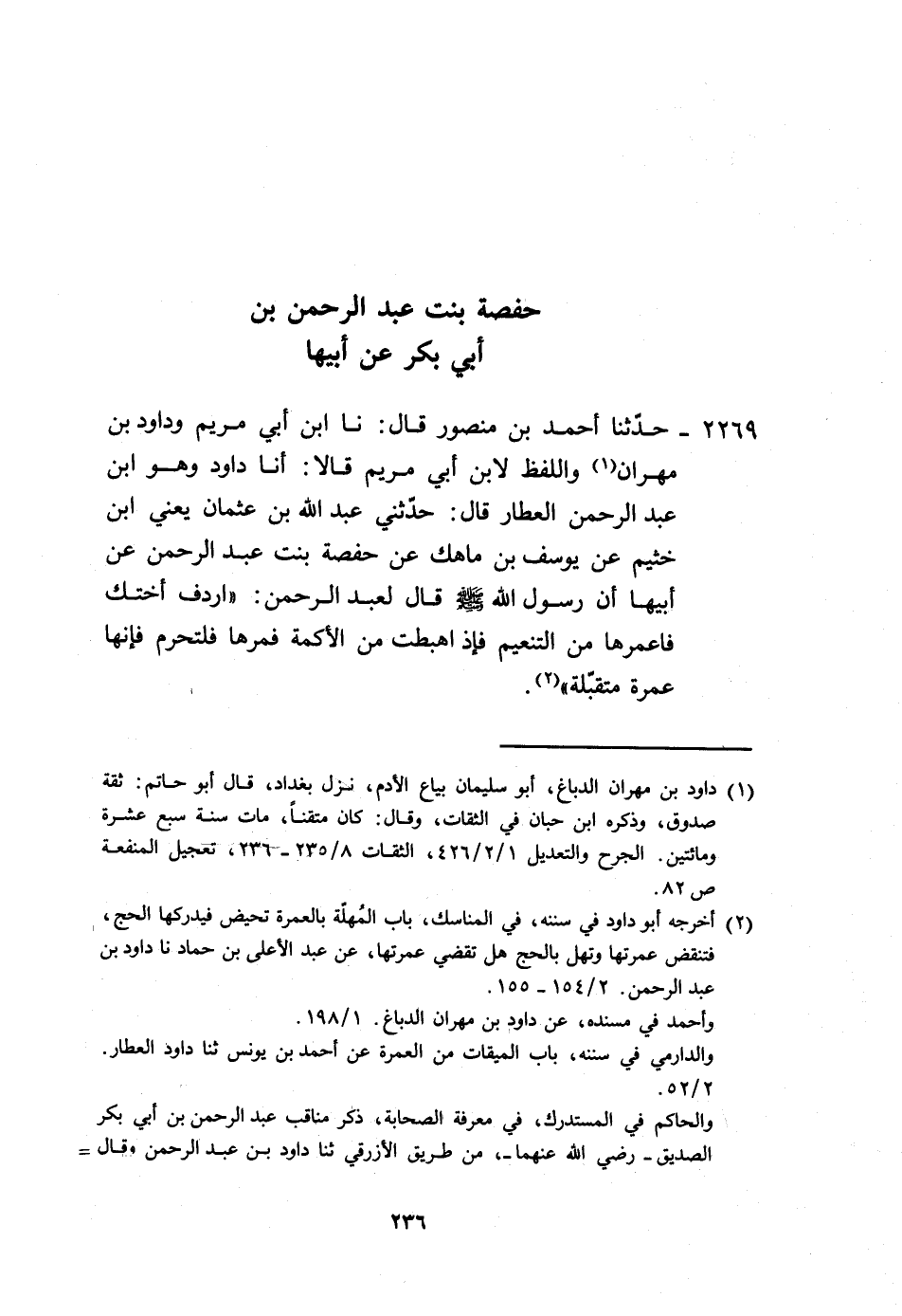2269 - حَدَّثَنَا أَحْمَدُ بْنُ مَنْصُورٍ، قَالَ: نا ابْنُ أَبِي مَرْيَمَ، وَدَاوُدُ بْنُ مِهْرَانَ، وَاللَّفْظُ لِابْنِ أَبِي مَرْيَمَ، قَالَا: أنا دَاوُدُ وَهُوَ ابْنُ عَبْدِ الرَّحْمَنِ الْعَطَّارُ، قَالَ: حَدَّثَنِي عَبْدُ اللَّهِ بْنُ عُثْمَانَ يَعْنِي ابْنَ خُثَيْمٍ، عَنْ يُوسُفَ بْنِ مَاهَكٍ، عَنْ حَفْصَةَ بِنْتِ عَبْدِ الرَّحْمَنِ، عَنْ أَبِيهَا، أَنَّ رَسُولَ اللَّهِ صَلَّى اللهُ عَلَيْهِ وَسَلَّمَ قَالَ لِعَبْدِ الرَّحْمَنِ: «§أَرْدِفْ أُخْتَكَ فَأَعْمِرْهَا مِنَ التَّنْعِيمِ فَإِذَا أُهْبِطَتْ مِنَ الْأَكَمَةِ فَمُرْهَا فَلْتُحْرِمْ فَإِنَّهَا عُمْرَةٌ مُتَقَبَّلَةٌ» -[237]-.