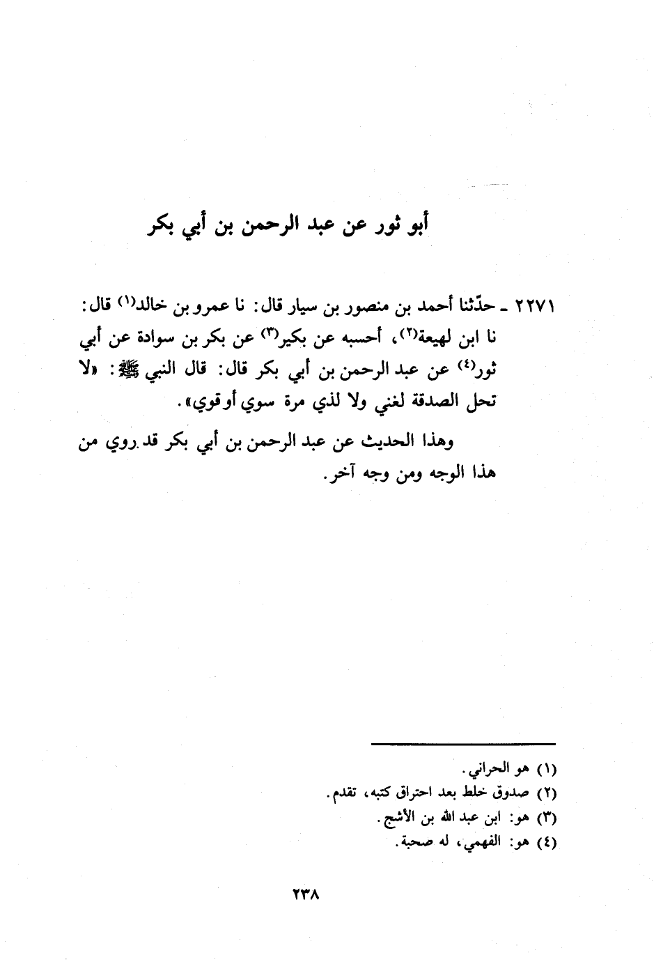 2271 - حَدَّثَنَا أَحْمَدُ بْنُ مَنْصُورِ بْنِ سَيَّارٍ، قَالَ: نا عَمْرُو بْنُ خَالِدٍ، قَالَ: نا ابْنُ لَهِيعَةَ، أَحْسِبُهُ عَنْ بُكَيْرٍ، عَنْ بَكْرِ بْنِ سَوَادَةَ، عَنْ أَبِي ثَوْرٍ، عَنْ عَبْدِ الرَّحْمَنِ بْنِ أَبِي بَكْرٍ، قَالَ: قَالَ النَّبِيُّ صَلَّى اللهُ عَلَيْهِ وَسَلَّمَ: «§لَا تَحِلُّ الصَّدَقَةُ لِغَنِيٍّ، وَلَا لِذِي مِرَّةٍ سَوِيٍّ أَوْ قَوِيٍّ» . وَهَذَا الْحَدِيثُ، عَنْ عَبْدِ الرَّحْمَنِ بْنِ أَبِي بَكْرٍ قَدْ رُوِيَ مِنْ هَذَا الْوَجْهِ وَمِنْ وَجْهٍ آخَرَ