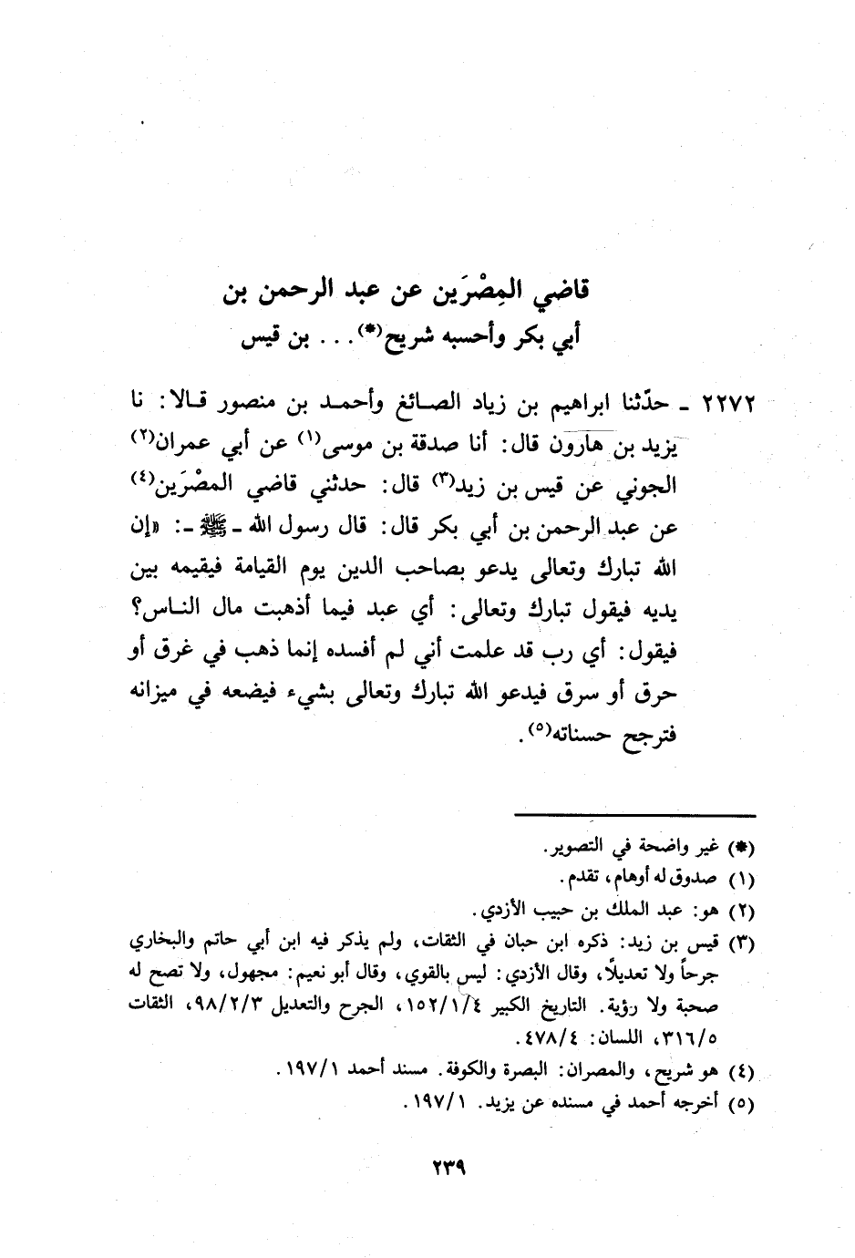 2272 - حَدَّثَنَا إِبْرَاهِيمُ بْنُ زِيَادٍ الصَّائِغُ، وَأَحْمَدُ بْنُ مَنْصُورٍ، قَالَا: نا يَزِيدُ بْنُ هَارُونَ، قَالَ: أنا صَدَقَةُ بْنُ مُوسَى، عَنْ أَبِي عِمْرَانَ الْجَوْنِيُّ، عَنْ قَيْسِ بْنِ زَيْدٍ، قَالَ: حَدَّثَنِي قَاضِي الْمِصْرَيْنِ، عَنْ عَبْدِ الرَّحْمَنِ بْنِ أَبِي بَكْرٍ، قَالَ: قَالَ رَسُولُ اللَّهِ صَلَّى اللهُ عَلَيْهِ وَسَلَّمَ: " إِنَّ §اللَّهَ تَبَارَكَ وَتَعَالَى يَدْعُو بِصَاحِبِ الدَّيْنِ يَوْمَ الْقِيَامَةِ فَيُقِيمُهُ بَيْنَ يَدَيْهِ فَيَقُولُ تَبَارَكَ وَتَعَالَى: أَيْ عَبْدُ فِيمَا أَذْهَبْتَ مَالَ النَّاسِ؟ فَيَقُولُ: أَيْ رَبِّ قَدْ عَلِمْتَ أَنِّي لَمْ أُفْسِدْهُ إِنَّمَا ذَهَبَ فِي غَرَقٍ أَوْ حَرَقٍ أَوْ سَرَقٍ فَيَدْعُو اللَّهَ تَبَارَكَ وَتَعَالَى بِشَيْءٍ فَيَضَعُهُ فِي مِيزَانِهِ فَتَرْجَحُ حَسَنَاتُهُ " -[240]-. وَهَذَا الْكَلَامُ لَا نَعْلَمُهُ يُرْوَى إِلَّا عَنْ عَبْدِ الرَّحْمَنِ بْنِ أَبِي بَكْرٍ، عَنِ النَّبِيِّ صَلَّى اللهُ عَلَيْهِ وَسَلَّمَ بِهَذَا الْإِسْنَادِ
