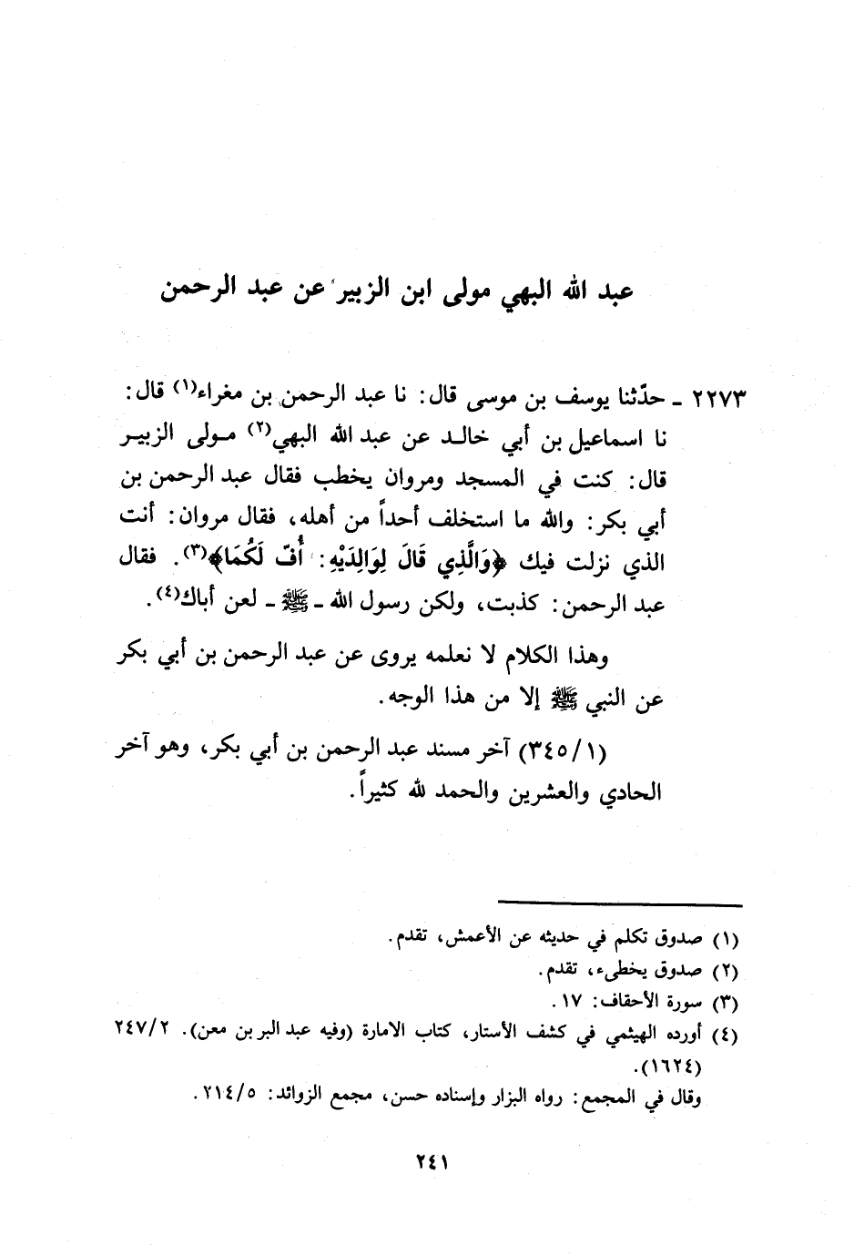 2273 - حَدَّثَنَا يُوسُفُ بْنُ مُوسَى، قَالَ: نا عَبْدُ الرَّحْمَنِ بْنُ مَغْرَاءَ، قَالَ: نَا إِسْمَاعِيلُ بْنُ أَبِي خَالِدٍ، عَنْ عَبْدِ اللَّهِ الْبَهِيِّ، مَوْلَى الزُّبَيْرِ، قَالَ: كُنْتُ فِي الْمَسْجِدِ وَمَرْوَانُ يَخْطُبُ، فَقَالَ عَبْدُ الرَّحْمَنِ بْنُ أَبِي بَكْرٍ: وَاللَّهِ مَا اسْتَخْلَفَ أَحَدًا مِنْ أَهْلِهِ، فَقَالَ مَرْوَانُ: §أَنْتَ الَّذِي نَزَلَتْ فِيكَ {وَالَّذِي قَالَ لِوَالِدَيْهِ أُفٍّ لَكُمَا} [الأحقاف: 17] فَقَالَ عَبْدُ الرَّحْمَنِ: كَذَبْتَ، وَلَكِنَّ رَسُولَ اللَّهِ صَلَّى اللهُ عَلَيْهِ وَسَلَّمَ لَعَنَ أَبَاكَ. وَهَذَا الْكَلَامُ لَا نَعْلَمُهُ يُرْوَى، عَنْ عَبْدِ الرَّحْمَنِ بْنِ أَبِي بَكْرٍ عَنِ النَّبِيِّ صَلَّى اللهُ عَلَيْهِ وَسَلَّمَ إِلَّا مِنْ هَذَا الْوَجْهِ