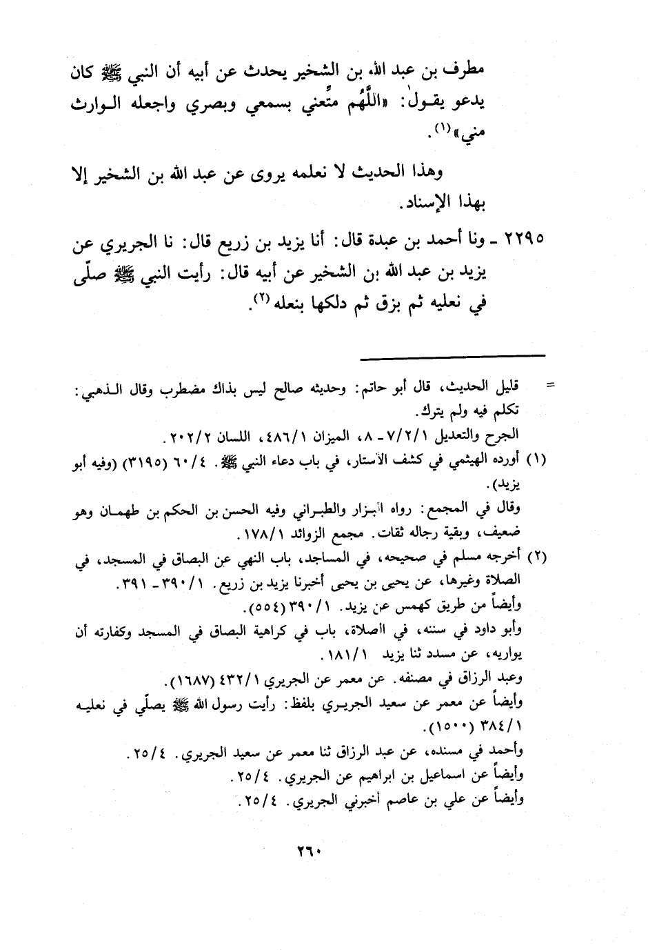 2295 - ونا أَحْمَدُ بْنُ عَبْدَةَ، قَالَ: أنا يَزِيدُ بْنُ زُرَيْعٍ، قَالَ: نا الْجُرَيْرِيُّ، عَنْ يَزِيدَ بْنِ عَبْدِ اللَّهِ بْنِ الشِّخِّيرِ، عَنْ أَبِيهِ، قَالَ: «رَأَيْتُ النَّبِيَّ صَلَّى اللهُ عَلَيْهِ وَسَلَّمَ §صَلَّى فِي نَعْلَيْهِ، ثُمَّ بَزَقَ، ثُمَّ دَلَكَهَا بِنَعْلِهِ» -[261]-. وَهَذَا الْحَدِيثُ هَكَذَا رَوَاهُ يَزِيدُ، عَنِ الْجُرَيْرِيِّ وَرَوَاهُ جَمَاعَةٌ، عَنِ الْجُرَيْرِيِّ، عَنْ يَزِيدَ، عَنْ مُطَرِّفٍ، عَنْ أَبِيهِ