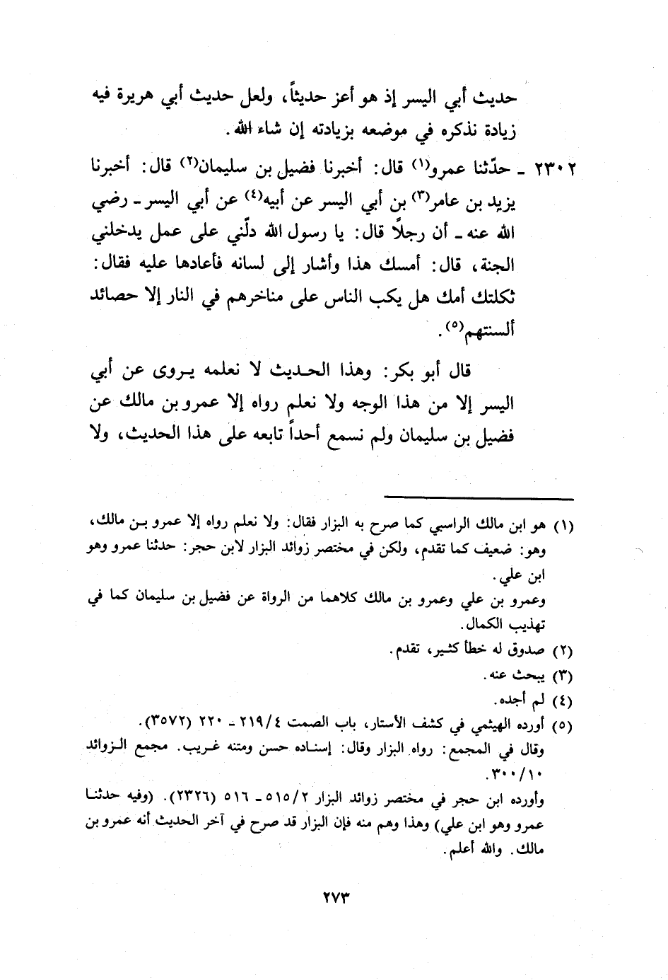 2302 - حَدَّثَنَا عَمْرٌو، قَالَ: أَخْبَرَنَا فُضَيْلُ بْنُ سُلَيْمَانَ، قَالَ: أَخْبَرَنَا يَزِيدُ بْنُ عَامِرِ بْنِ أَبِي الْيَسَرِ، عَنْ أَبِيهِ، عَنْ أَبِي الْيَسَرٍ رَضِيَ اللَّهُ عَنْهُ، أَنَّ رَجُلًا قَالَ: يَا رَسُولَ اللَّهِ، دُلَّنِي عَلَى عَمَلٍ يُدْخِلُنِي الْجَنَّةَ، قَالَ: «أَمْسِكْ هَذَا - وَأَشَارَ إِلَى لِسَانِهِ -» فَأَعَادَهَا عَلَيْهِ فَقَالَ: «ثَكِلَتْكَ أُمُّكَ، §هَلْ يُكَبُّ النَّاسَ عَلَى مَنَاخِرِهِمْ فِي النَّارِ إِلَّا حَصَائِدُ أَلْسِنَتُهُمْ» . قَالَ أَبُو بَكْرٍ: وَهَذَا الْحَدِيثُ لَا نَعْلَمُهُ يُرْوَى عَنْ أَبِي الْيَسَرِ إِلَّا مِنْ هَذَا الْوَجْهِ، وَلَا نَعْلَمُ رَوَاهُ إِلَّا عَمْرُو بْنُ مَالِكٍ، عَنْ فُضَيْلِ بْنِ سُلَيْمَانَ وَلَمْ نَسْمَعُ أَحَدًا تَابَعَهُ عَلَى هَذَا الْحَدِيثِ وَلَا -[274]- رَأَيْنَاهُ عِنْدَ غَيْرِهِ بِإِسْنَادٍ خِلَافَ هَذَا الْإِسْنَادِ فَنَعْلَمُ أَنَّهُ قَدْ أَوْهَمَ فِيهِ، أَوْ يَكُونَ الْمُصِيبَ، فَلَمَّا لَمْ نَعْلَمْ لَهُ عِلَّةً ذَكَرْنَاهُ إِذْ كَانَ إِسْنَادُهُ حَسَنًا وَمَتْنُهُ غَرِيبًا