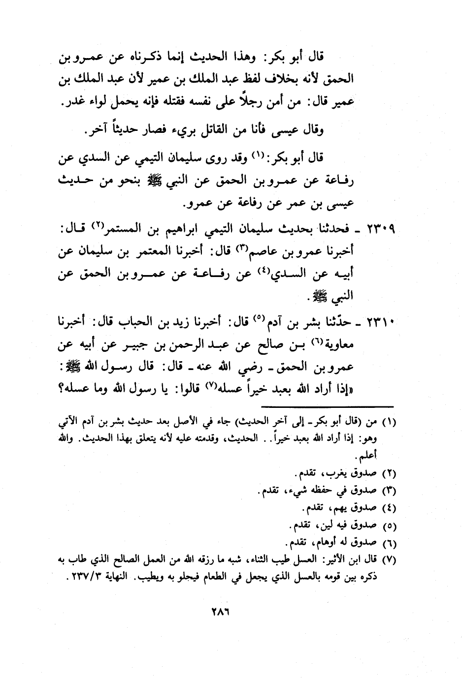 2309 - فَحَدَّثَنَا بِحَدِيثِ سُلَيْمَانَ التَّيْمِيِّ، إِبْرَاهِيمُ بْنُ الْمُسْتَمِرِّ، قَالَ: أَخْبَرَنَا عَمْرُو بْنُ عَاصِمٍ، قَالَ: أَخْبَرَنَا الْمُعْتَمِرُ بْنُ سُلَيْمَانَ، عَنْ أَبِيهِ، عَنِ السُّدِّيِّ، عَنْ رِفَاعَةَ، عَنْ عَمْرِو بْنِ الْحَمِقِ، عَنِ النَّبِيِّ صَلَّى اللهُ عَلَيْهِ وَسَلَّمَ. حَدَّثَنَا بِشْرُ بْنُ آدَمَ، قَالَ: أَخْبَرَنَا زَيْدُ بْنُ الْحُبَابِ، قَالَ: أَخْبَرَنَا مُعَاوِيَةُ بْنُ صَالِحٍ، عَنْ عَبْدِ الرَّحْمَنِ بْنِ جُبَيْرٍ، عَنْ أَبِيهِ، عَنْ عَمْرِو بْنِ الْحَمِقِ رَضِيَ اللَّهُ عَنْهُ، قَالَ: قَالَ رَسُولُ اللَّهِ صَلَّى اللهُ عَلَيْهِ وَسَلَّمَ: «§إِذَا أَرَادَ اللَّهُ بِعَبْدٍ خَيْرًا عَسَلَهُ» قَالُوا: يَا رَسُولَ اللَّهِ، وَمَا عَسَلُهُ؟ -[287]- قَالَ: «يُوَفِّقُهُ لِعَمَلٍ صَالِحٍ، ثُمَّ يَقْبِضُهُ عَلَيْهِ»
