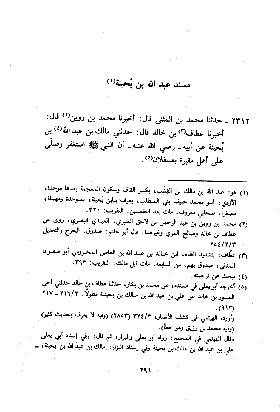 2312 - حدثنا محمد بن المثنى قال أخبرنا محمد بن روين قال أخبرنا عطاف بن خالد قال حدثني مالك بن عبد الله بن بحينة عَنْ أَبِيهِ رَضِيَ اللَّهُ عَنْهُ أَنَّ النَّبِيَّ استغفر وصلى على أهل مقبرة بعسقلان