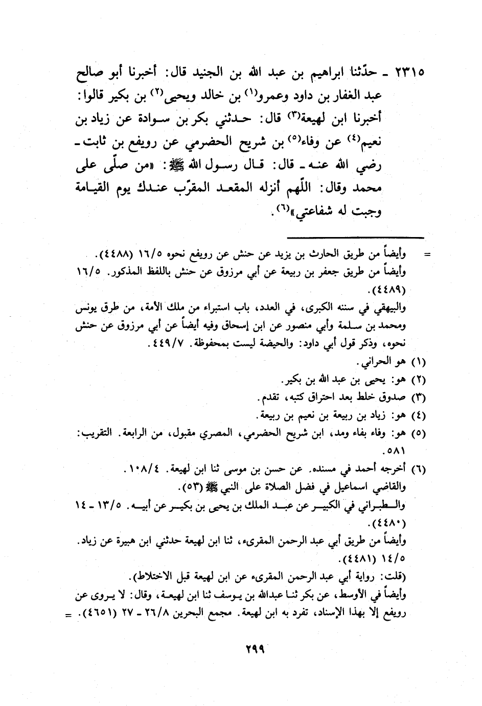 2315 - حَدَّثَنَا إِبْرَاهِيمُ بْنُ عَبْدِ اللَّهِ بْنِ الْجُنَيْدِ، قَالَ: أَخْبَرَنَا أَبُو صَالِحٍ عَبْدُ الْغَفَّارِ بْنُ دَاوُدَ، وَعَمْرُو بْنُ خَالِدٍ، وَيَحْيَى بْنُ بُكَيْرٍ، قَالُوا: أَخْبَرَنَا ابْنُ لَهِيعَةَ، قَالَ: حَدَّثَنِي بَكْرُ بْنُ سَوَادَةَ، عَنْ زِيَادِ بْنِ نُعَيْمٍ، عَنْ وَفَاءِ بْنِ شُرَيْحٍ الْحَضْرَمِيِّ، عَنْ رُوَيْفِعِ بْنِ ثَابِتٍ رَضِيَ اللَّهُ عَنْهُ، قَالَ: قَالَ رَسُولُ اللَّهِ صَلَّى اللهُ عَلَيْهِ وَسَلَّمَ: " §مَنْ صَلَّى عَلَى مُحَمَّدٍ وَقَالَ: اللَّهُمَّ أَنْزِلْهُ الْمَقْعَدَ الْمُقَرَّبَ عِنْدَكَ يَوْمَ الْقِيَامَةِ وَجَبَتْ لَهُ شَفَاعَتِي " -[300]-. وَهَذَا الْحَدِيثُ لَا نَعْلَمُ أَحَدًا يَرْوِيهِ، عَنْ رَسُولِ اللَّهِ صَلَّى اللهُ عَلَيْهِ وَسَلَّمَ بِهَذَا اللَّفْظِ إِلَّا رُوَيْفِعُ بْنُ ثَابِتٍ وَحْدَهُ
