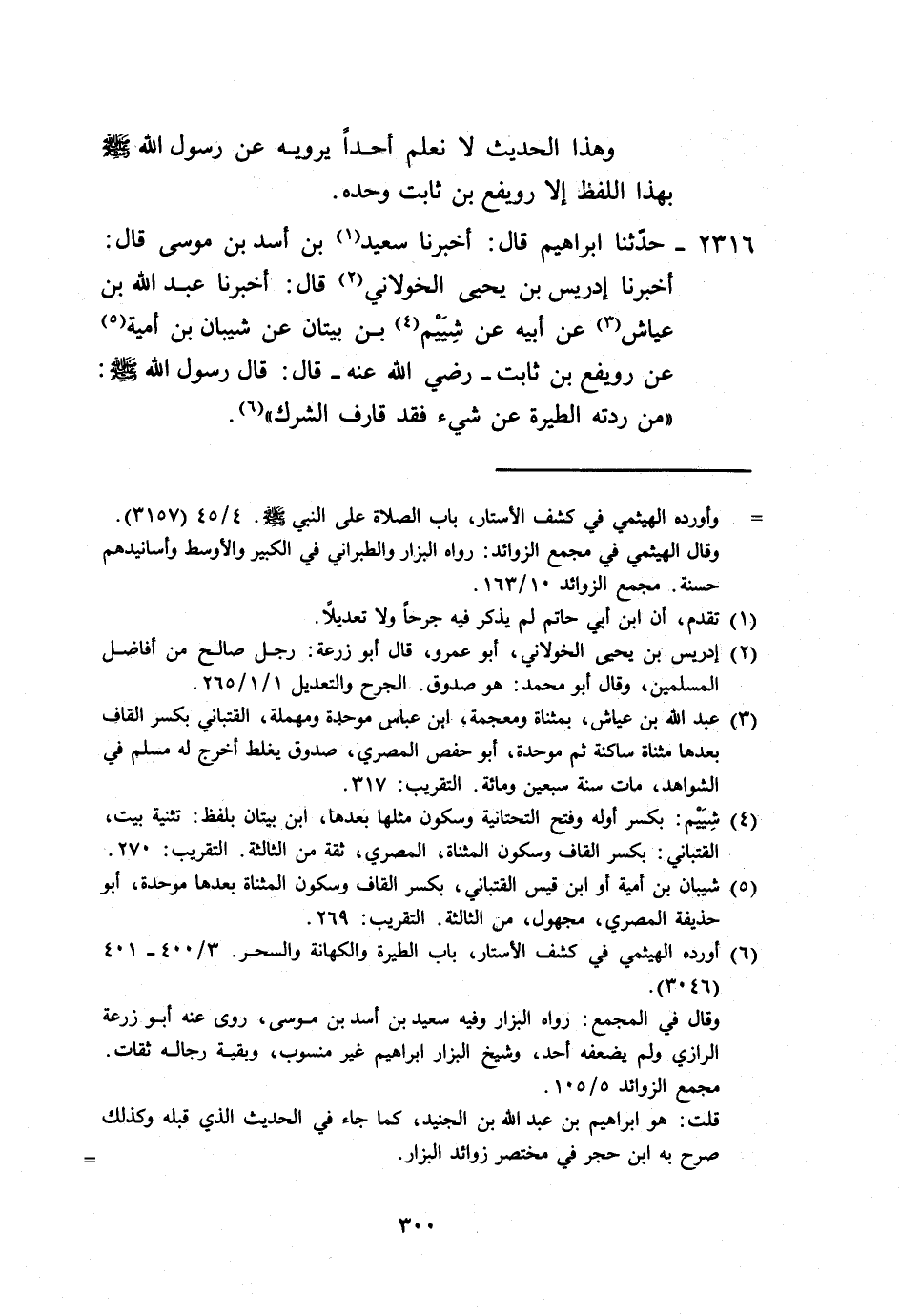 2316 - حَدَّثَنَا إِبْرَاهِيمُ، قَالَ: أَخْبَرَنَا سَعِيدُ بْنُ أَسَدِ بْنِ مُوسَى، قَالَ: أَخْبَرَنَا إِدْرِيسُ بْنُ يَحْيَى الْخَوْلَانِيُّ، قَالَ: أَخْبَرَنَا عَبْدُ اللَّهِ بْنُ عَيَّاشٍ، عَنْ أَبِيهِ، عَنْ شُيَيْمِ بْنِ بَيْتَانَ، عَنْ شَيْبَانَ بْنِ أُمَيَّةَ، عَنْ رُوَيْفِعِ بْنِ ثَابِتٍ رَضِيَ اللَّهُ عَنْهُ، قَالَ: قَالَ رَسُولُ اللَّهِ صَلَّى اللهُ عَلَيْهِ وَسَلَّمَ: «§مَنْ رَدَّتْهُ الطِّيَرَةُ عَنْ شَيْءٍ فَقَدْ قَارَفَ الشِّرْكَ» -[301]-. وَهَذَا الْحَدِيثُ لَا نَعْلَمُ أَحَدًا يَرْوِيهِ بِهَذَا اللَّفْظِ إِلَّا رُوَيْفِعُ بْنُ ثَابِتٍ وَحْدَهُ، وَشُيَيْمُ بْنُ بَيْتَانَ غَيْرُ مَشْهُورٍ، وَإِنَّمَا ذَكَرْنَا حَدِيثَهُ إِذْ كَانَ لَا يُرْوَى عَنْ رَسُولِ اللَّهِ صَلَّى اللهُ عَلَيْهِ وَسَلَّمَ هَذَا الْكَلَامُ إِلَّا عَنْهُ وَقَدْ رَوَى غَيْرَ هَذَا الْحَدِيثِ أَيْضًا