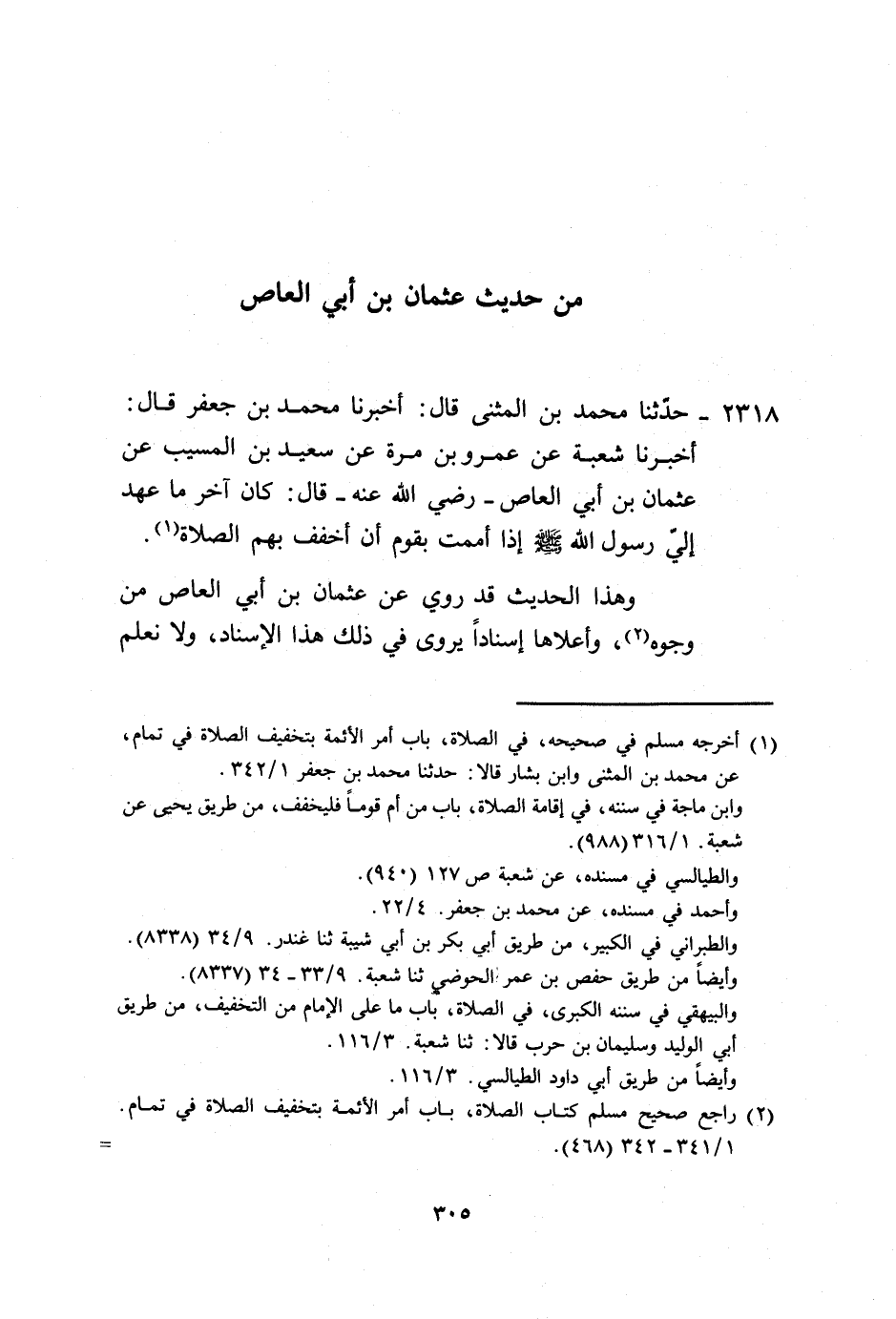 2318 - حَدَّثَنَا مُحَمَّدُ بْنُ الْمُثَنَّى، قَالَ: أَخْبَرَنَا مُحَمَّدُ بْنُ جَعْفَرٍ، قَالَ: أَخْبَرَنَا شُعْبَةُ، عَنْ عَمْرِو بْنِ مُرَّةَ، عَنْ سَعِيدِ بْنِ الْمُسَيِّبِ، عَنْ عُثْمَانَ بْنِ أَبِي الْعَاصِ رَضِيَ اللَّهُ عَنْهُ، قَالَ: «كَانَ آخِرُ مَا عَهِدَ إِلَيَّ رَسُولُ اللَّهِ صَلَّى اللهُ عَلَيْهِ وَسَلَّمَ §إِذَا أَمَمْتُ بِقَوْمٍ أَنْ أُخَفِّفَ بِهِمُ الصَّلَاةَ» . وَهَذَا الْحَدِيثُ قَدْ رُوِيَ عَنْ عُثْمَانَ بْنِ أَبِي الْعَاصِ مِنْ وُجُوهٍ، وَأَعْلَاهَا إِسْنَادًا يُرْوَى فِي ذَلِكَ هَذَا الْإِسْنَادُ وَلَا نَعْلَمُ -[306]- رَوَى سَعِيدُ بْنُ الْمُسَيِّبِ، عَنْ عُثْمَانَ بْنِ أَبِي الْعَاصِ غَيْرَ هَذَا الْحَدِيثِ، وَلَا رَوَاهُ عَنْ سَعِيدِ بْنِ الْمُسَيِّبِ إِلَّا عَمْرُو بْنُ مُرَّةَ، وَلَا عَنْ عَمْرٍو إِلَّا شُعْبَةُ، فَذَكَرْنَا هَذَا الْإِسْنَادَ عَنْ عُثْمَانَ دُونَ سَائِرِ الْأَسَانِيدِ الَّتِي تُرْوَى فِي ذَلِكَ عَنْهُ إِلَّا أَنَّ يَزِيدَ زَائِدٌ فَيُكْتَبُ مِنْ أَجْلِ الزِّيَادَةِ