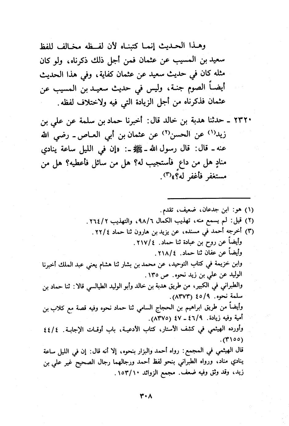 2320 - حَدَّثَنَا هُدْبَةُ بْنُ خَالِدٍ، قَالَ: أَخْبَرَنَا حَمَّادُ بْنُ سَلَمَةَ، عَنْ عَلِيِّ بْنِ زَيْدٍ، عَنِ الْحَسَنِ، عَنْ عُثْمَانَ بْنِ أَبِي الْعَاصِ، رَضِيَ اللَّهُ عَنْهُ قَالَ: قَالَ رَسُولُ اللَّهِ صَلَّى اللهُ عَلَيْهِ وَسَلَّمَ: " إِنَّ §فِي اللَّيْلِ سَاعَةً يُنَادِي مُنَادٍ هَلْ مِنْ دَاعٍ فَأَسْتَجِيبَ لَهُ: هَلْ مِنْ سَائِلٍ فَأُعْطِيَهُ، هَلْ مِنْ مُسْتَغْفِرٍ فَأَغْفِرَ لَهُ " -[309]- وَهَذَا الْحَدِيثُ قَدْ رُوِيَ نَحْوَ كَلَامِهِ عَنِ النَّبِيِّ صَلَّى اللهُ عَلَيْهِ وَسَلَّمَ بِأَلْفَاظٍ مُخْتَلِفَةٍ نَذْكُرُ كُلَّ حَدِيثٍ مِنْهَا بِلَفْظِهِ فِي مَوْضِعِهِ إِنْ شَاءَ اللَّهُ، وَلَا نَعْلَمُ أَنَّ أَحَدًا يُحَدِّثُهُ بِهَذَا الْحَدِيثِ، عَنْ عُثْمَانَ بْنِ أَبِي الْعَاصِ، إِلَّا مِنْ هَذَا الْوَجْهِ بِهَذَا الْإِسْنَادِ