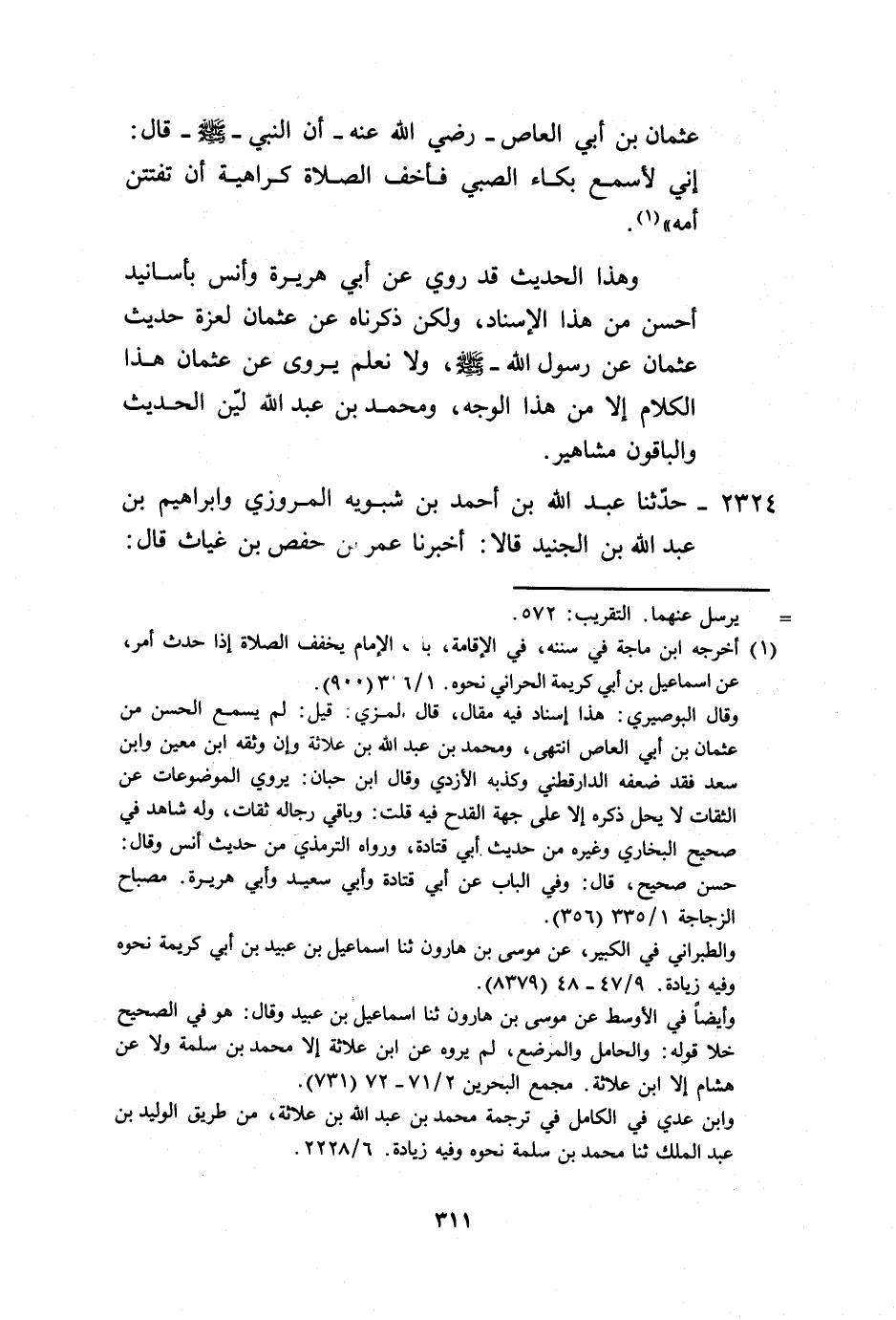 2324 - حَدَّثَنَا عَبْدُ اللَّهِ بْنُ أَحْمَدَ بْنِ شَبُّوَيْهِ الْمَرْوَزِيُّ، وَإِبْرَاهِيمُ بْنُ عَبْدِ اللَّهِ بْنِ الْجُنَيْدِ، قَالَا: أَخْبَرَنَا عُمَرُ بْنُ حَفْصِ بْنِ غِيَاثٍ، قَالَ -[312]-: أَخْبَرَنَا أَبِي، عَنْ عَبْدِ الرَّحْمَنِ بْنِ إِسْحَاقَ، عَنْ يَزِيدَ بْنِ الْحَكَمِ، وَهُوَ ابْنُ أَخِي عُثْمَانَ بْنِ أَبِي الْعَاصِ، عَنْ عُثْمَانَ بْنِ أَبِي الْعَاصِ رَضِيَ اللَّهُ عَنْهُ، قَالَ: قَالَ رَسُولُ اللَّهِ صَلَّى اللهُ عَلَيْهِ وَسَلَّمَ: «§لَقَدِ اسْتَجَنَّ بِجُنَّةٍ كَثِيفَةٍ مِنَ النَّارِ مَنْ سَلَفَ بَيْنَ يَدَيْهِ ثَلَاثَةٌ مِنَ الْوَلَدِ فِي الْإِسْلَامِ» . وَهَذَا الْحَدِيثُ لَا نَحْفَظُ لَهُ طَرِيقًا عَنْ عُثْمَانَ إِلَّا هَذَا، وَلَا يُحْفَظُ هَذَا اللَّفْظُ عَنْ رَسُولِ اللَّهِ صَلَّى اللهُ عَلَيْهِ وَسَلَّمَ إِلَّا مِنْ هَذَا الْوَجْهِ بِهَذَا الْإِسْنَادِ، وَإِنْ كَانَ قَدْ رُوِيَ نَحْوُ مَعْنَاهُ عَنْ رَسُولِ اللَّهِ صَلَّى اللهُ عَلَيْهِ وَسَلَّمَ مِنْ وُجُوهٍ، وَعَبْدُ الرَّحْمَنِ بْنُ إِسْحَاقَ كُوفِيُّ يُقَالُ لَهُ أَبُو شَيْبَةَ، حَدَّثَ عَنْهُ مَرْوَانُ بْنُ مُعَاوِيَةَ، وَمُحَمَّدُ بْنُ فُضَيْلٍ، وَالْقَاسِمُ بْنُ مَالِكٍ، وَعَبْدُ الْوَاحِدِ بْنُ زِيَادٍ، وَحَفْصُ بْنُ غِيَاثٍ وَغَيْرَهُمْ، وَلَيْسَ حَدِيثُهُ حَدِيثَ حَافِظٍ، وَقَدِ احْتُمِلَ حَدِيثُهُ