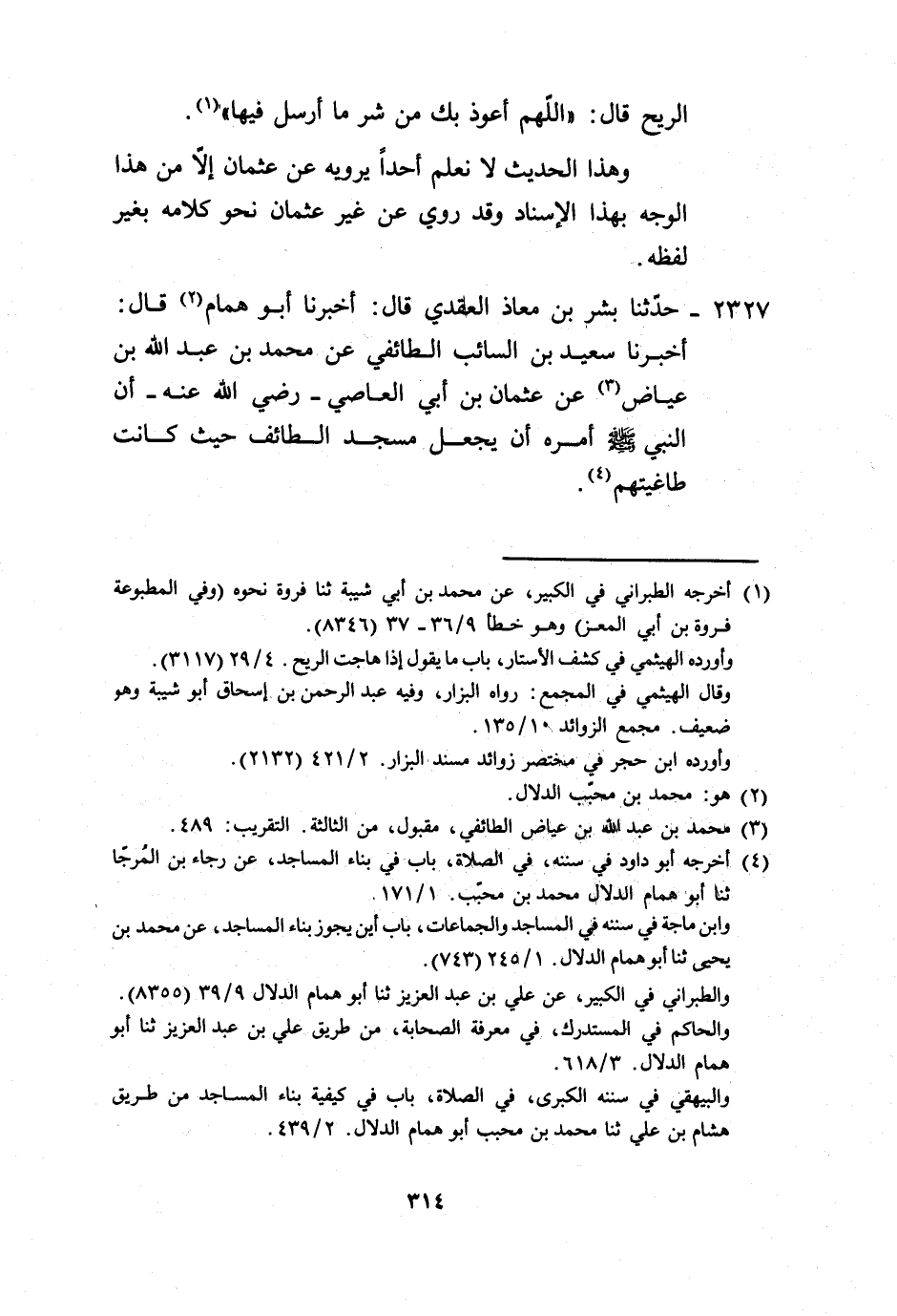 2327 - حَدَّثَنَا بِشْرُ بْنُ مُعَاذٍ الْعَقَدِيُّ، قَالَ: أَخْبَرَنَا أَبُو هَمَّامٍ، قَالَ: أَخْبَرَنَا سَعِيدُ بْنُ السَّائِبِ الطَّائِفِيُّ، عَنْ مُحَمَّدِ بْنِ عَبْدِ اللَّهِ بْنِ عِيَاضٍ، عَنْ عُثْمَانَ بْنِ أَبِي الْعَاصِ رَضِيَ اللَّهُ عَنْهُ، «أَنَّ النَّبِيَّ صَلَّى اللهُ عَلَيْهِ وَسَلَّمَ §أَمَرَهُ أَنْ يَجْعَلَ مَسْجِدَ الطَّائِفِ حَيْثُ كَانَتْ طَاغِيَتُهُمْ» -[315]-. وَهَذَا الْحَدِيثُ لَا نَعْلَمُهُ يُرْوَى إِلَّا، عَنْ عُثْمَانَ بْنِ أَبِي الْعَاصِ بِهَذَا الْإِسْنَادِ