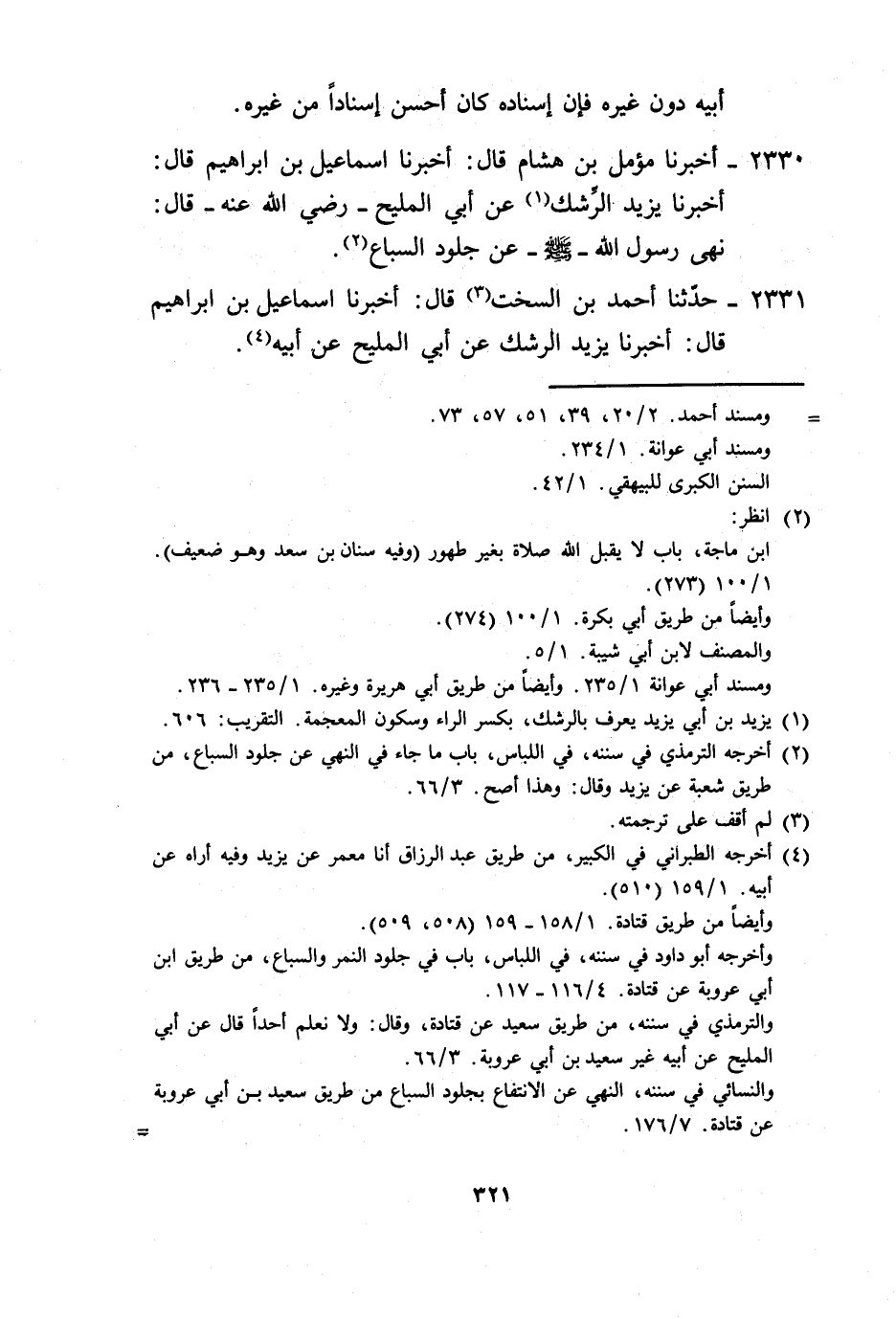 2330 - أَخْبَرَنَا مُؤَمَّلُ بْنُ هِشَامٍ، قَالَ: أَخْبَرَنَا إِسْمَاعِيلُ بْنُ إِبْرَاهِيمَ، قَالَ: أَخْبَرَنَا يَزِيدُ الرِّشْكُ، عَنْ أَبِي الْمَلِيحِ رَضِيَ اللَّهُ عَنْهُ قَالَ: «§نَهَى رَسُولُ اللَّهِ صَلَّى اللهُ عَلَيْهِ وَسَلَّمَ، عَنْ جُلُودِ السِّبَاعِ»