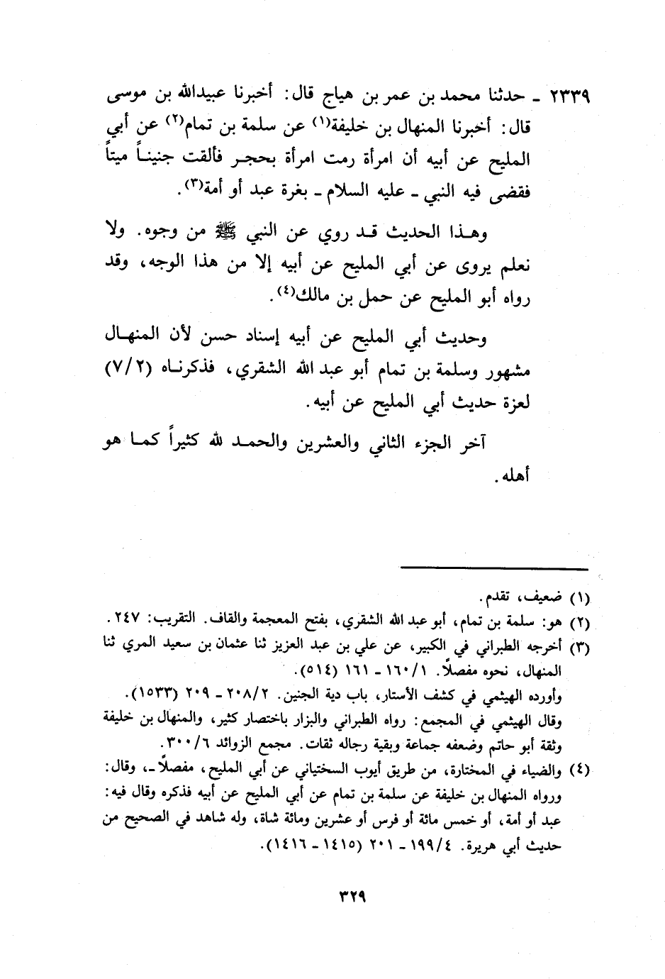 2339 - حَدَّثَنَا مُحَمَّدُ بْنُ عُمَرَ بْنِ هَيَّاجٍ، قَالَ: أَخْبَرَنَا عُبَيْدُ اللَّهِ بْنُ مُوسَى، قَالَ: أَخْبَرَنَا الْمِنْهَالُ بْنُ خَلِيفَةَ، عَنْ سَلَمَةَ بْنِ تَمَامٍ، عَنْ أَبِي الْمَلِيحِ، عَنْ أَبِيهِ، «أَنَّ §امْرَأَةً رَمَتِ امْرَأَةً بِحَجَرٍ، فَأَلْقَتْ جَنِينًا مَيِّتًا، فَقَضَى فِيهِ النَّبِيُّ - عَلَيْهِ السَّلَامُ - بِغُرَّةِ عَبْدٍ أَوْ أَمَةٍ» . وَهَذَا الْحَدِيثُ قَدْ رُوِيَ عَنِ النَّبِيِّ صَلَّى اللهُ عَلَيْهِ وَسَلَّمَ مِنْ وُجُوهٍ وَلَا نَعْلَمُ يُرْوَى، عَنْ أَبِي الْمَلِيحِ، عَنْ أَبِيهِ إِلَّا مِنْ هَذَا الْوَجْهِ، وَقَدْ رَوَاهُ أَبُو الْمَلِيحِ، عَنْ حَمَلِ بْنِ مَالِكِ، وَحَدِيثُ أَبِي الْمَلِيحِ، عَنْ أَبِيهِ إِسْنَادٌ حَسَنٌ لِأَنَّ الْمِنْهَالَ مَشْهُورٌ، وَسَلَمَةُ بْنُ تَمَامٍ وَأَبُو عَبْدِ اللَّهِ الشَّقَرِيُّ فَذَكَرْنَاهُ لِعِزَّةِ حَدِيثِ أَبِي الْمَلِيحِ، عَنْ أَبِيهِ
