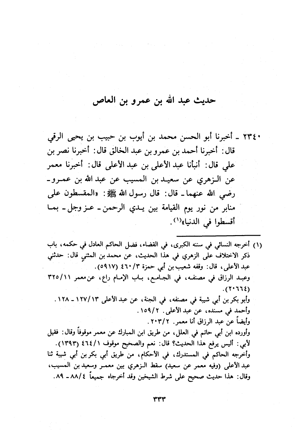 2340 - أَخْبَرَنَا أَبُو الْحَسَنِ مُحَمَّدُ بْنُ أَيُّوبَ بْنِ حَبِيبِ بْنِ يَحْيَى الرَّقِّيُّ، قَالَ: أَخْبَرَنَا أَحْمَدُ بْنُ عَمْرِو بْنِ عَبْدِ الْخَالِقِ، قَالَ: أَخْبَرَنَا نَصْرُ بْنُ عَلِيٍّ، قَالَ: أَنْبَأَنَا عَبْدُ الْأَعْلَى بْنُ عَبْدٍ الْأَعْلَى، قَالَ: أَخْبَرَنَا مَعْمَرٌ، عَنِ الزُّهْرِيِّ، عَنْ سَعِيدِ بْنِ الْمُسَيِّبِ، عَنْ عَبْدِ اللَّهِ بْنِ عَمْرٍو رَضِيَ اللَّهُ عَنْهُمَا، قَالَ: قَالَ رَسُولُ اللَّهِ صَلَّى اللهُ عَلَيْهِ وَسَلَّمَ: «§الْمُقْسِطُونَ عَلَى مَنَابِرَ مِنْ نُورٍ يَوْمَ الْقِيَامَةِ بَيْنَ يَدَيِ الرَّحْمَنِ عَزَّ وَجَلَّ بِمَا أَقْسَطُوا فِي الدُّنْيَا» -[334]-. وَهَذَا الْحَدِيثُ لَا نَعْلَمُ رَوَاهُ عَنِ النَّبِيِّ صَلَّى اللهُ عَلَيْهِ وَسَلَّمَ إِلَّا عَبْدُ اللَّهِ بْنُ عَمْرٍو