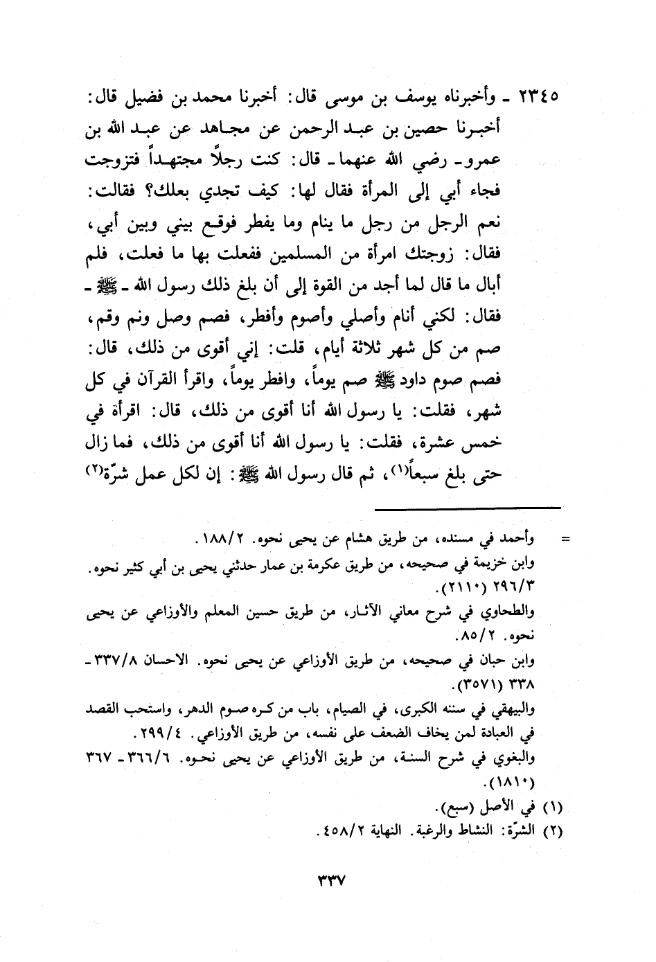 2345 - وَأَخْبَرَنَاهُ يُوسُفُ بْنُ مُوسَى، قَالَ: أَخْبَرَنَا مُحَمَّدُ بْنُ فُضَيْلٍ، قَالَ: أَخْبَرَنَا حُصَيْنُ بْنُ عَبْدِ الرَّحْمَنِ، عَنْ مُجَاهِدٍ، عَنْ عَبْدِ اللَّهِ بْنِ عَمْرٍو رَضِيَ اللَّهُ عَنْهُمَا، قَالَ: كُنْتُ رَجُلًا مُجْتَهِدًا فَتَزَوَّجْتُ فَجَاءَ أَبِي إِلَى الْمَرْأَةِ فَقَالَ لَهَا: كَيْفَ تَجِدِي بَعْلَكِ؟ فَقَالَتْ: نِعْمَ الرَّجُلُ مِنْ رَجُلٍ مَا يَنَامُ وَمَا يُفْطِرُ فَوَقَعَ بَيْنِي وَبَيْنَ أَبِي، فَقَالَ: زَوَّجْتُكَ امْرَأَةً مِنَ الْمُسْلِمِينَ فَفَعَلْتَ بِهَا مَا فَعَلْتَ؟ فَلَمْ أُبَالِ مَا قَالَ لِمَا أَجِدُ مِنَ الْقُوَّةِ إِلَى أَنْ بَلَغَ ذَلِكَ رَسُولَ اللَّهِ صَلَّى اللهُ عَلَيْهِ وَسَلَّمَ، فَقَالَ: «لَكِنِّي أَنَامُ وَأُصَلِّي وَأَصُومُ وَأُفْطِرُ، فَصُمْ وَصَلِّ وَنَمْ وَقُمْ، صُمْ مِنْ كُلِّ شَهْرٍ ثَلَاثَةَ أَيَّامٍ» قُلْتُ: إِنِّي أَقْوَى مِنْ ذَلِكَ، قَالَ: «§فَصُمْ صَوْمَ دَاوُدَ، صُمْ يَوْمًا وَأَفْطِرْ يَوْمًا، وَاقْرَأِ الْقُرْآنَ فِي كُلِّ شَهْرٍ» فَقُلْتُ: يَا رَسُولَ اللَّهِ، أَنَا أَقْوَى مِنْ ذَلِكَ، قَالَ: «اقْرَأْهُ فِي خَمْسَ عَشْرَةَ» فَقُلْتُ: يَا رَسُولَ اللَّهِ، أَنَا أَقْوَى مِنْ ذَلِكَ، فَمَا زَالَ حَتَّى بَلَغَ سَبْعًا، ثُمَّ قَالَ رَسُولُ اللَّهِ صَلَّى اللهُ عَلَيْهِ وَسَلَّمَ: «إِنَّ لِكُلِّ عَمَلٍ شِرَّةً -[338]-، وَلِكُلِّ شِرَّةٍ فَتْرَةً، فَمَنْ كَانَتْ فَتْرَتُهُ إِلَى سُنَّتِي فَقَدِ اهْتَدَى، وَمَنْ كَانَتْ فَتْرَتُهُ إِلَى غَيْرِ ذَلِكَ فَقَدْ هَلَكَ» فَقَالَ عَبْدُ اللَّهِ بْنُ عَمْرٍو: لَمَّا كَبِرَ وَضَعُفَ لَأَنْ أَكُونَ قَبِلْتُ رُخْصَةَ رَسُولِ اللَّهِ صَلَّى اللهُ عَلَيْهِ وَسَلَّمَ أَحَبُّ إِلَيَّ مِنْ أَهْلِي وَمَالِي