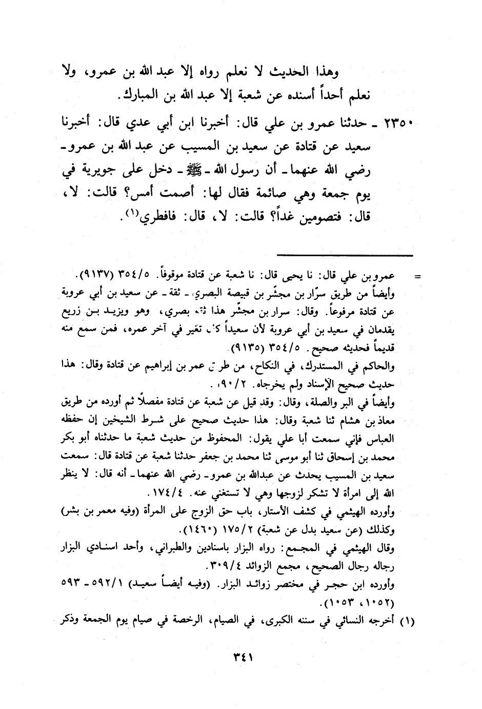 2350 - حَدَّثَنَا عَمْرِو بْنُ عَلِيٍّ، قَالَ: أَخْبَرَنَا ابْنُ أَبِي عَدِيٍّ، قَالَ: أَخْبَرَنَا سَعِيدُ، عَنْ قَتَادَةَ، عَنْ سَعِيدِ بْنِ الْمُسَيِّبِ، عَنْ عَبْدِ اللَّهِ بْنِ عَمْرٍو رَضِيَ اللَّهُ عَنْهُمَا، أَنَّ رَسُولَ اللَّهِ صَلَّى اللهُ عَلَيْهِ وَسَلَّمَ دَخَلَ عَلَى جُوَيْرِيَةَ فِي يَوْمِ جُمُعَةٍ وَهِيَ صَائِمَةٌ فَقَالَ لَهَا: «أَصُمْتِ أَمْسِ؟» قَالَتْ: لَا، قَالَ: «فَتَصُومِينَ غَدًا؟» قَالَتْ: لَا، قَالَ: «§فَأَفْطِرِي» -[342]-. وَهَذَا الْحَدِيثُ خَالَفَ فِيهِ سَعِيدٌ شُعْبَةَ. فَقَالَ شُعْبَةُ: حَدَّثَنَاهُ قَتَادَةُ، عَنْ أَبِي أَيُّوبَ، عَنْ جُوَيْرِيَةَ، وَقَالَ سَعِيدٌ: أَمَّا -[343]- مَا حَفِظْتُ أَنَا وَمُطَرِّفٌ، عَنْ قَتَادَةَ، عَنِ ابْنِ الْمُسَيِّبِ، عَنْ عَبْدِ اللَّهِ بْنِ عَمْرٍو، عَنِ النَّبِيِّ صَلَّى اللهُ عَلَيْهِ وَسَلَّمَ