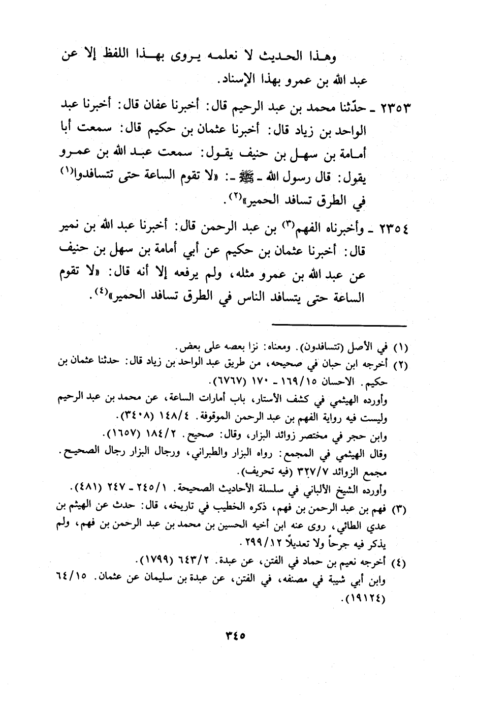 2354 - وَأَخْبَرَنَاهُ الْفَهْمُ بْنُ عَبْدِ الرَّحْمَنِ، قَالَ: أَخْبَرَنَا عَبْدُ اللَّهِ بْنُ نُمَيْرٍ، قَالَ: أَخْبَرَنَا عُثْمَانُ بْنُ حَكِيمٍ، عَنْ أَبِي أُمَامَةَ بْنِ سَهْلِ بْنِ حُنَيْفٍ، عَنْ عَبْدِ اللَّهِ بْنِ عَمْرٍو، مِثْلَهُ وَلَمْ يَرْفَعْهُ إِلَّا أَنَّهُ قَالَ: «§لَا تَقُومُ السَّاعَةُ حَتَّى يَتَسَافَدَ النَّاسُ فِي الطُّرُقِ تَسَافُدَ الْحَمِيرِ» -[346]-. وَهَذَا الْحَدِيثُ لَا نَعْلَمُهُ يُرْوَى مِنْ وَجْهٍ صَحِيحٍ إِلَّا عَنْ عَبْدِ اللَّهِ بْنِ عَمْرٍو بِهَذَا الْإِسْنَادِ