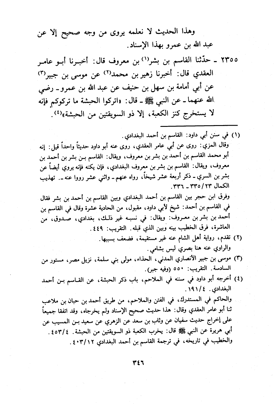 2355 - حَدَّثَنَا الْقَاسِمُ بْنُ بِشْرِ بْنِ مَعْرُوفٍ، قَالَ: أَخْبَرَنَا أَبُو عَامِرٍ الْعَقَدِيُّ، قَالَ: أَخْبَرَنَا زُهَيْرُ بْنُ مُحَمَّدٍ، عَنْ مُوسَى بْنِ جُبَيْرٍ، عَنْ أَبِي أُمَامَةَ بْنِ سَهْلِ بْنِ حُنَيْفٍ، عَنْ عَبْدِ اللَّهِ بْنِ عَمْرٍو رَضِيَ اللَّهُ عَنْهُمَا، عَنِ النَّبِيِّ صَلَّى اللهُ عَلَيْهِ وَسَلَّمَ قَالَ: «§اتْرُكُوا الْحَبَشَةَ مَا تَرَكُوكُمْ فَإِنَّهُ لَا يَسْتَخْرِجُ كَنْزَ الْكَعْبَةِ إِلَّا ذُو السُّوَيْقَتَيْنِ مِنَ الْحَبَشَةَ» -[347]-. وَهَذَا الْحَدِيثُ لَا نَعْلَمُهُ يُرْوَى بِهَذَا اللَّفْظِ إِلَّا عَنْ عَبْدِ اللَّهِ بْنِ عَمْرٍو بِهَذَا الْإِسْنَادِ، وَلَا نَعْلَمُ أَحَدًا قَالَ عَنْ أَبِي أُمَامَةَ، عَنْ عَبْدِ اللَّهِ بْنِ عَمْرٍو إِلَّا الْقَاسِمُ بْنُ بِشْرٍ، عَنْ أَبِي عَامِرٍ، وَقَالَ: غَيْرُهُ، عَنْ أَبِي أُمَامَةَ، عَنْ رَجُلٍ مِنْ أَصْحَابِ النَّبِيِّ صَلَّى اللهُ عَلَيْهِ وَسَلَّمَ