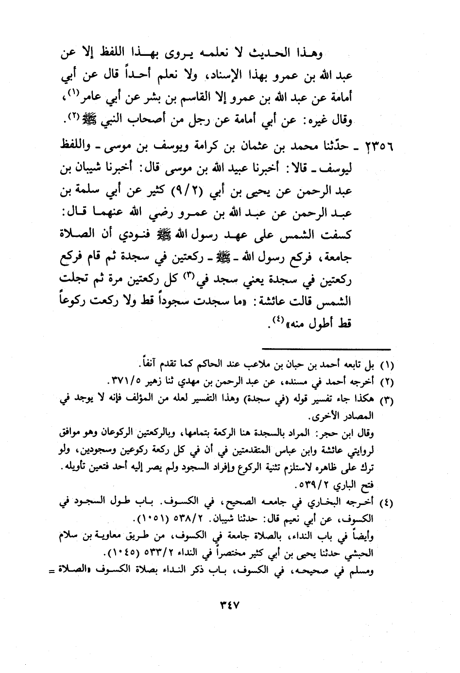 2356 - حَدَّثَنَا مُحَمَّدُ بْنُ عُثْمَانَ بْنِ كَرَامَةَ، وَيُوسُفُ بْنُ مُوسَى، وَاللَّفْظُ لِيُوسُفَ، قَالَا: أَخْبَرَنَا عُبَيْدُ اللَّهِ بْنُ مُوسَى، قَالَ: أَخْبَرَنَا شَيْبَانُ بْنُ عَبْدِ الرَّحْمَنِ، عَنْ يَحْيَى بْنِ أَبِي كَثِيرٍ، عَنْ أَبِي سَلَمَةَ بْنِ عَبْدِ الرَّحْمَنِ، عَنْ عَبْدِ اللَّهِ بْنِ عَمْرٍو رَضِيَ اللَّهُ عَنْهُمَا، قَالَ: «§كَسَفَتِ الشَّمْسُ عَلَى عَهْدِ رَسُولِ اللَّهِ صَلَّى اللهُ عَلَيْهِ وَسَلَّمَ فَنُودِيَ أَنَّ الصَّلَاةَ جَامِعَةٌ فَرَكَعَ رَسُولُ اللَّهِ صَلَّى اللهُ عَلَيْهِ وَسَلَّمَ رَكْعَتَيْنِ فِي سَجْدَةٍ، ثُمَّ قَامَ فَرَكَعَ رَكْعَتَيْنِ فِي سَجْدَةٍ يَعْنِي سَجْدَةً فِي كُلِّ رَكْعَتَيْنِ مَرَّةً، ثُمَّ تَجَلَّتِ الشَّمْسُ» ، قَالَتْ عَائِشَةُ: مَا سَجَدْتُ سُجُودًا قَطُّ وَلَا رَكَعْتُ رُكُوعًا قَطُّ أَطْوَلَ مِنْهُ