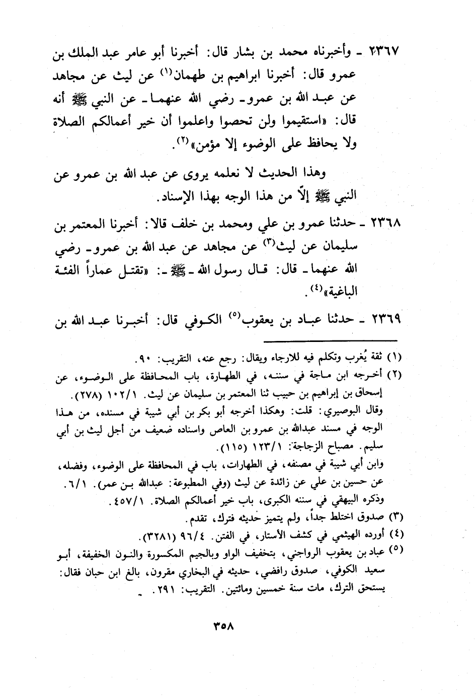 2367 - وَأَخْبَرَنَاهُ مُحَمَّدُ بْنُ بَشَّارٍ، قَالَ: أَخْبَرَنَا أَبُو عَامِرٍ عَبْدُ الْمَلِكِ بْنُ عَمْرٍو، قَالَ: أَخْبَرَنَا إِبْرَاهِيمُ بْنُ طَهْمَانَ، عَنْ لَيْثٍ، عَنْ مُجَاهِدٍ، عَنْ عَبْدِ اللَّهِ بْنِ عَمْرٍو رَضِيَ اللَّهُ عَنْهُمَا، عَنِ النَّبِيِّ صَلَّى اللهُ عَلَيْهِ وَسَلَّمَ أَنَّهُ قَالَ: «§اسْتَقِيمُوا وَلَنْ تُحْصُوا، وَاعْلَمُوا أَنَّ خَيْرَ أَعْمَالِكُمُ الصَّلَاةُ وَلَا يُحَافِظُ عَلَى الْوُضُوءِ إِلَّا مُؤْمِنٌ» . وَهَذَا الْحَدِيثُ لَا نَعْلَمُهُ يُرْوَى، عَنْ عَبْدِ اللَّهِ بْنِ عَمْرٍو عَنِ النَّبِيِّ صَلَّى اللهُ عَلَيْهِ وَسَلَّمَ إِلَّا مِنْ هَذَا الْوَجْهِ بِهَذَا الْإِسْنَادِ