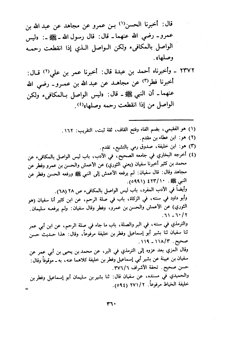 2372 - وَأَخْبَرَنَاهُ أَحْمَدُ بْنُ عَبْدَةَ، قَالَ: أَخْبَرَنَا عُمَرُ بْنُ عَلِيٍّ، قَالَ: أَخْبَرَنَا فِطْرٌ، عَنْ مُجَاهِدٍ، عَنْ عَبْدِ اللَّهِ بْنِ عَمْرٍو رَضِيَ اللَّهُ عَنْهُمَا أَنَّ النَّبِيَّ صَلَّى اللهُ عَلَيْهِ وَسَلَّمَ قَالَ: «§لَيْسَ الْوَاصِلُ بِالْمُكَافِئِ وَلَكِنَّ الْوَاصِلَ مَنْ إِذَا انْقَطَعَتْ رَحِمُهُ وَصَلَهَا» -[361]-. وَهَذَا الْحَدِيثُ لَا نَعْلَمُهُ يُرْوَى عَنْ عَبْدِ اللَّهِ بْنِ عَمْرٍو إِلَّا مِنْ هَذَا الْوَجْهِ بِهَذَا الْإِسْنَادِ