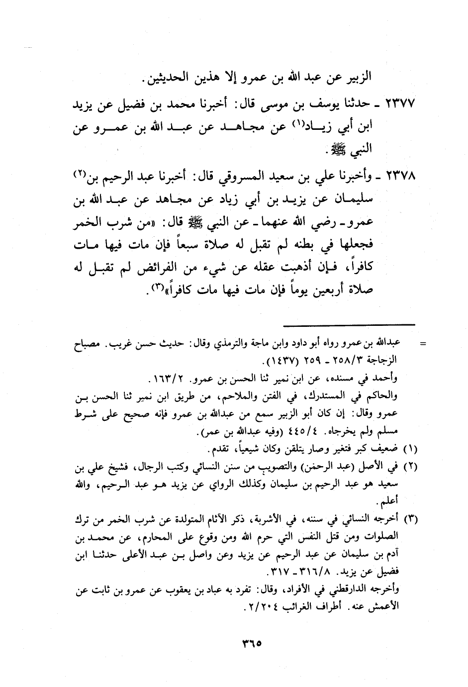 2378 - وَأَخْبَرَنَا عَلِيُّ بْنُ سَعِيدٍ الْمَسْرُوقِيُّ، قَالَ: أَخْبَرَنَا عَبْدُ الرَّحِيمِ بْنُ سُلَيْمَانَ، عَنْ يَزِيدَ بْنِ أَبِي زِيَادٍ، عَنْ مُجَاهِدٍ، عَنْ عَبْدِ اللَّهِ بْنِ عَمْرٍو رَضِيَ اللَّهُ عَنْهُمَا، عَنِ النَّبِيِّ صَلَّى اللهُ عَلَيْهِ وَسَلَّمَ قَالَ: «§مَنْ شَرِبَ الْخَمْرَ فَجَعَلَهَا فِي بَطْنِهِ لَمْ تُقْبَلْ لَهُ صَلَاةٌ سَبْعًا، فَإِنْ مَاتَ فِيهَا مَاتَ كَافِرًا، فَإِنْ أَذْهَبَتْ عَقْلَهُ عَنْ شَيْءٍ مِنَ الْفَرَائِضِ لَمْ تُقْبَلْ لَهُ صَلَاةٌ أَرْبَعِينَ يَوْمًا، فَإِنْ مَاتَ فِيهَا مَاتَ كَافِرًا» -[366]-.