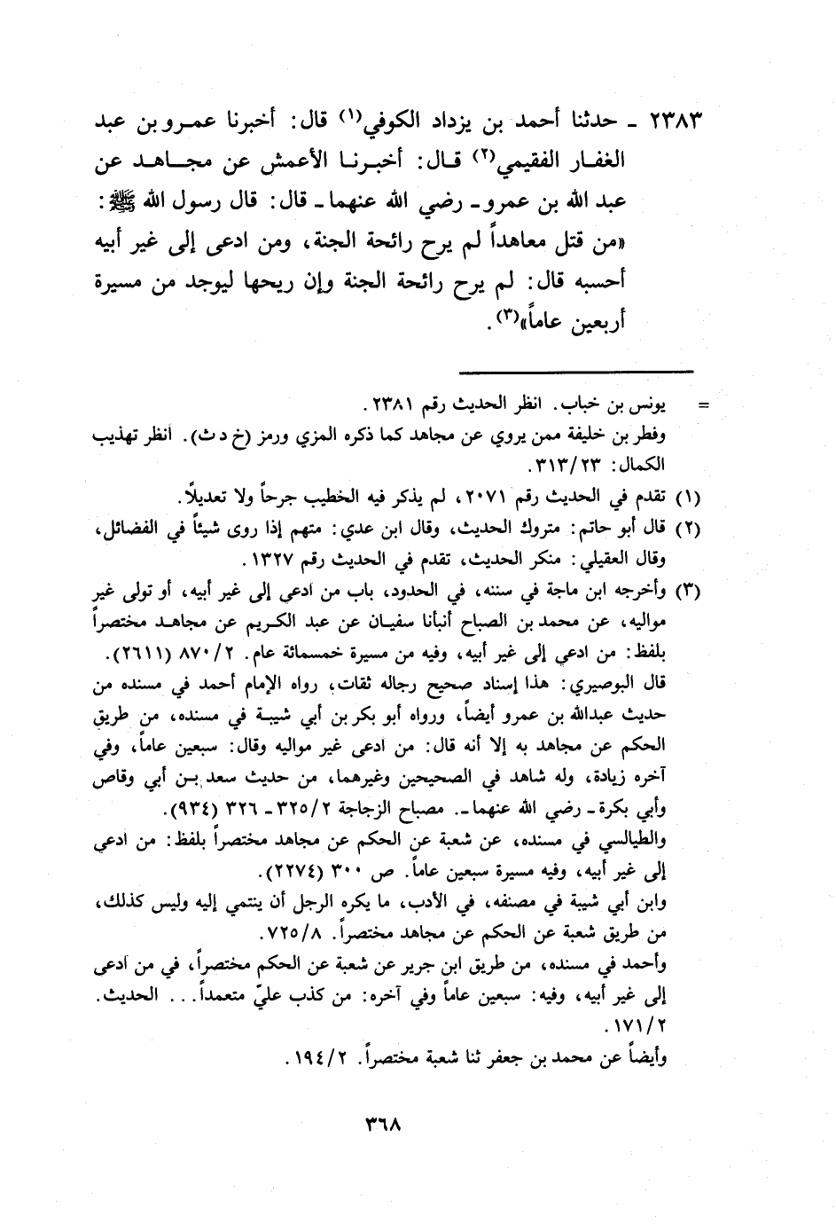 2383 - حَدَّثَنَا أَحْمَدُ بْنُ يَزْدَادٍ الْكُوفِيُّ، قَالَ: أَخْبَرَنَا عَمْرُو بْنُ عَبْدِ الْغَفَّارِ الْفُقَيْمِيُّ، قَالَ: أَخْبَرَنَا الْأَعْمَشُ، عَنْ مُجَاهِدٍ، عَنْ عَبْدِ اللَّهِ بْنِ عَمْرٍو رَضِيَ اللَّهُ عَنْهُمَا، قَالَ: قَالَ رَسُولُ اللَّهِ صَلَّى اللهُ عَلَيْهِ وَسَلَّمَ: «§مَنْ قَتَلَ مُعَاهِدًا لَمْ يُرَحْ رَائِحَةَ الْجَنَّةِ، وَمَنِ ادُّعِيَ إِلَى غَيْرِ أَبِيهِ - أَحْسِبُهُ قَالَ - لَمْ يُرَحْ رَائِحَةَ الْجَنَّةِ، وَإِنَّ رِيحَهَا لَيُوجَدُ مِنْ مَسِيرَةِ أَرْبَعِينَ عَامًا»