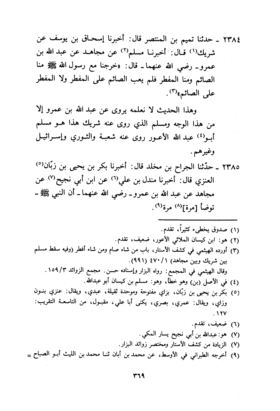 2387 - وَأَخْبَرَنَا مُحَمَّدُ بْنُ عَبْدِ الرَّحِيمِ، قَالَ: أَخْبَرَنَا سَعِيدُ بْنُ سُلَيْمَانَ، قَالَ: أَخْبَرَنَا إِسْحَاقُ بْنُ يَحْيَى بْنِ طَلْحَةَ، عَنْ مُجَاهِدٍ، عَنْ عَبْدِ اللَّهِ بْنِ عَمْرٍو رَضِيَ اللَّهُ عَنْهُمَا، عَنِ النَّبِيِّ صَلَّى اللهُ عَلَيْهِ وَسَلَّمَ، قَالَ: «§مَنْ كَذَبَ عَلَيَّ مُتَعَمِّدًا فَلْيَتَبَوَّأْ مَقْعَدَهُ مِنَ النَّارِ»
