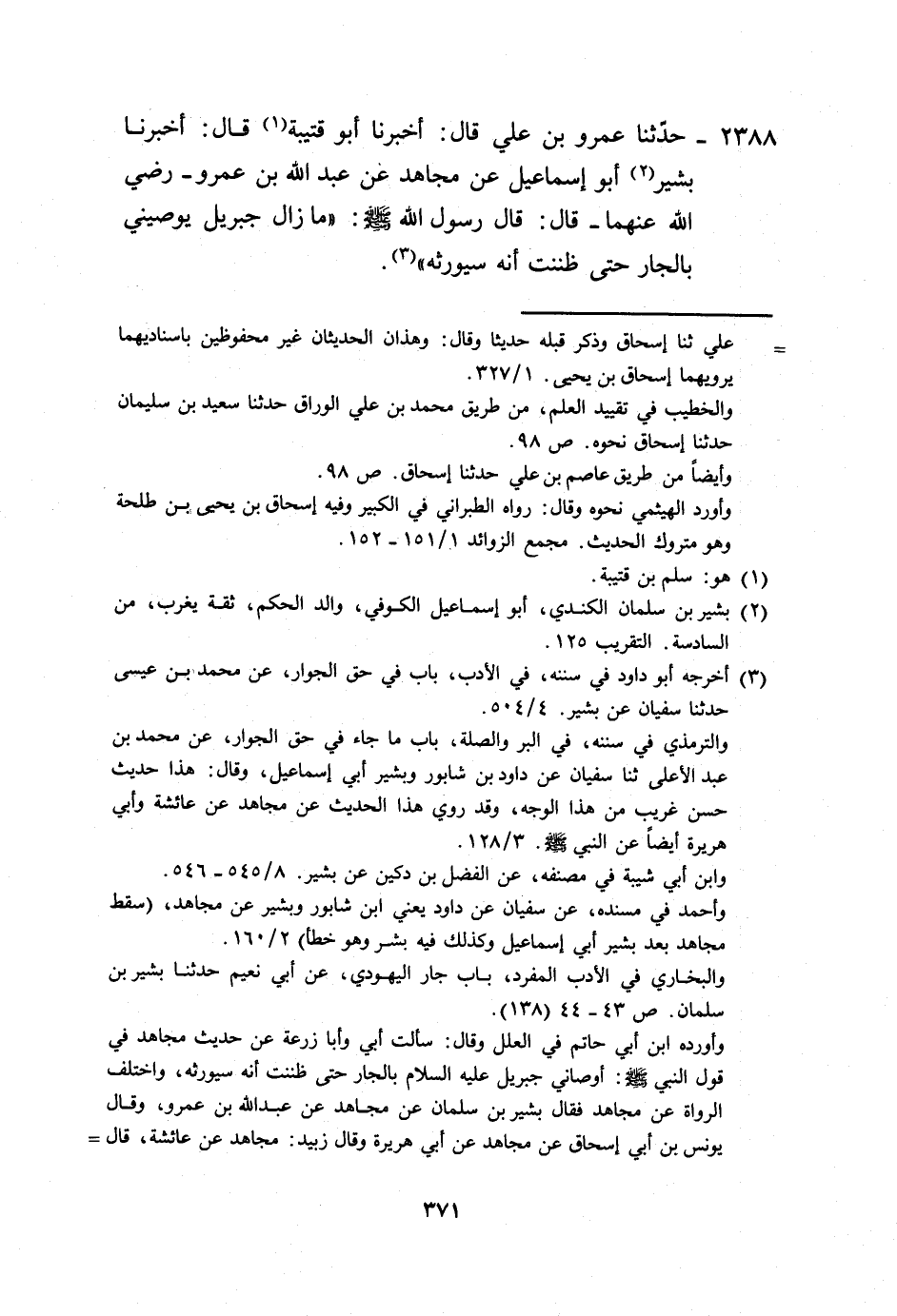 2388 - حَدَّثَنَا عَمْرُو بْنُ عَلِيٍّ، قَالَ: أَخْبَرَنَا أَبُو قُتَيْبَةَ، قَالَ: أَخْبَرَنَا بَشِيرٌ أَبُو إِسْمَاعِيلَ، عَنْ مُجَاهِدٍ، عَنْ عَبْدِ اللَّهِ بْنِ عَمْرٍو رَضِيَ اللَّهُ عَنْهُمَا، قَالَ: قَالَ رَسُولُ اللَّهِ صَلَّى اللهُ عَلَيْهِ وَسَلَّمَ: «§مَازَالَ جِبْرِيلُ يُوصِينِي بِالْجَارِ حَتَّى ظَنَنْتُ أَنَّهُ سَيُوَرِّثُهُ» -[372]-. وَهَذَا الْحَدِيثُ لَا نَعْلَمُ رَوَاهُ عَنْ مُجَاهِدٍ إِلَّا بَشِيرٌ، وَقَدِ اخْتَلَفُوا عَنْ مُجَاهِدٍ فِي هَذَا الْحَدِيثِ فَقَالَ زُبَيْدٌ الْأَيَامِيَّ، عَنْ مُجَاهِدٍ، عَنْ عَائِشَةَ، عَنِ النَّبِيِّ صَلَّى اللهُ عَلَيْهِ وَسَلَّمَ، وَقَالَ يُونُسُ بْنُ أَبِي إِسْحَاقَ، عَنْ مُجَاهِدٍ، عَنْ أَبِي هُرَيْرَةَ، عَنِ النَّبِيِّ صَلَّى اللهُ عَلَيْهِ وَسَلَّمَ، وَقَالَ -[373]- بَشِيرٌ: عَنْ مُجَاهِدٍ، عَنْ عَبْدِ اللَّهِ بْنِ عَمْرٍو