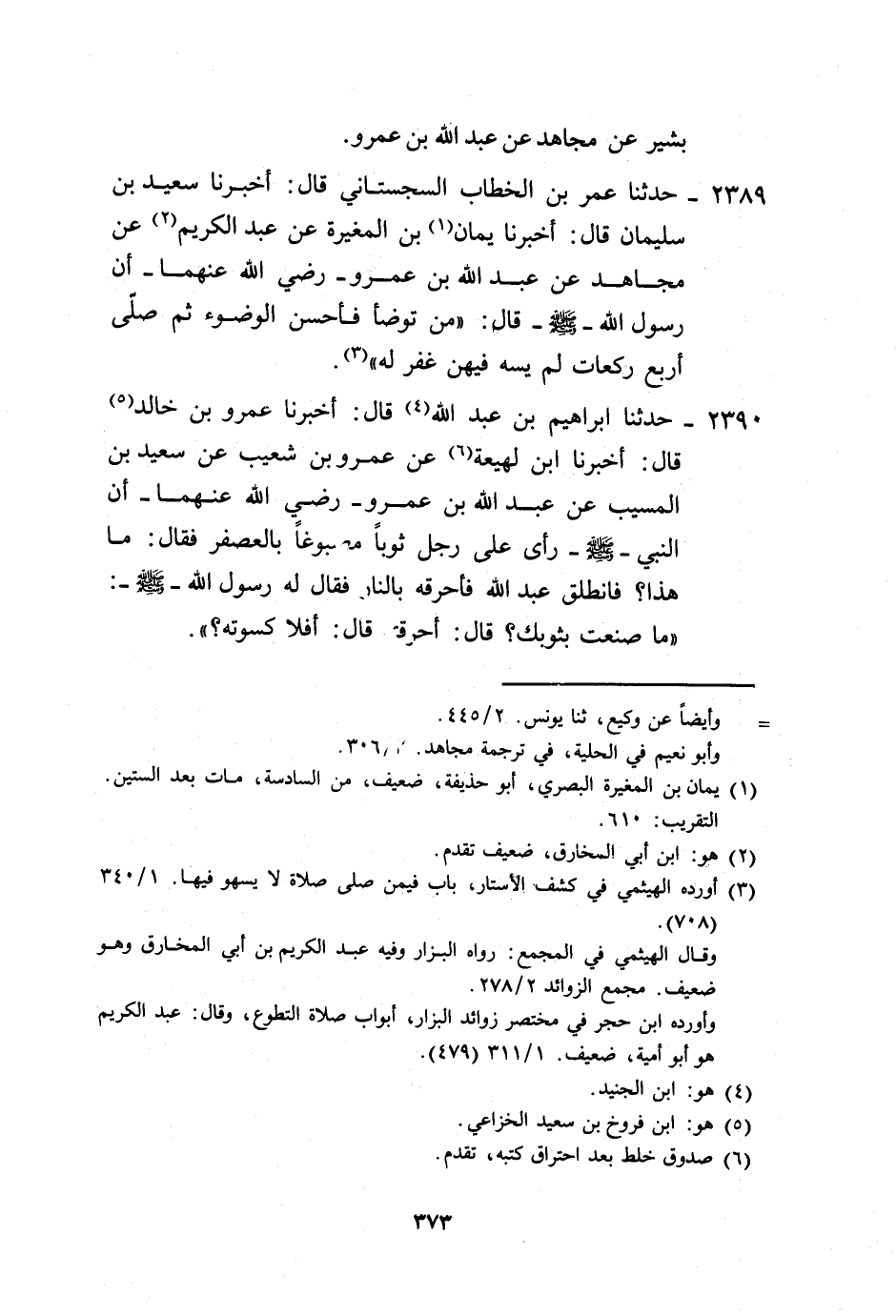 2389 - حَدَّثَنَا عُمَرُ بْنُ الْخَطَّابِ السِّجِسْتَانِيُّ، قَالَ: أَخْبَرَنَا سَعِيدُ بْنُ سُلَيْمَانَ، قَالَ: أَخْبَرَنَا يَمَانُ بْنُ الْمُغِيرَةِ، عَنْ عَبْدِ الْكَرِيمِ، عَنْ مُجَاهِدٍ، عَنْ عَبْدِ اللَّهِ بْنِ عَمْرٍو رَضِيَ اللَّهُ عَنْهُمَا، أَنَّ رَسُولَ اللَّهِ صَلَّى اللهُ عَلَيْهِ وَسَلَّمَ قَالَ: «§مَنْ تَوَضَّأَ فَأَحْسَنَ الْوُضُوءَ ثُمَّ صَلَّى أَرْبَعَ رَكَعَاتٍ لَمْ يَسْهُ فِيهِنَّ غُفِرَ لَهُ»