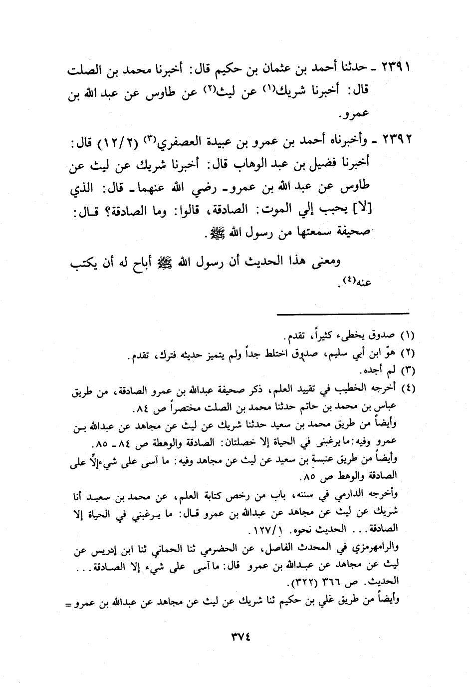 2392 - وَأَخْبَرَنَاهُ أَحْمَدُ بْنُ عَمْرِو بْنِ عُبَيْدَةَ الْعُصْفُرِيُّ، قَالَ: أَخْبَرَنَا فُضَيْلُ بْنُ عَبْدِ الْوَهَّابِ، قَالَ: أَخْبَرَنَا شَرِيكٌ، عَنْ لَيْثٍ، عَنْ طَاوُسٍ، عَنْ عَبْدِ اللَّهِ بْنِ عَمْرٍو رَضِيَ اللَّهُ عَنْهُمَا، قَالَ: " §الَّذِي لَا يُحَبِّبُ إِلَيَّ الْمَوْتَ: الصَّادِقَةُ "، قَالُوا: وَمَا الصَّادِقَةُ؟ قَالَ: «صَحِيفَةٌ سَمِعْتُهَا مِنْ رَسُولِ اللَّهِ صَلَّى اللهُ عَلَيْهِ وَسَلَّمَ» . وَمَعْنَى هَذَا الْحَدِيثِ أَنَّ رَسُولَ اللَّهِ صَلَّى اللهُ عَلَيْهِ وَسَلَّمَ أَبَاحَ لَهُ أَنْ يَكْتُبَ عَنْهُ