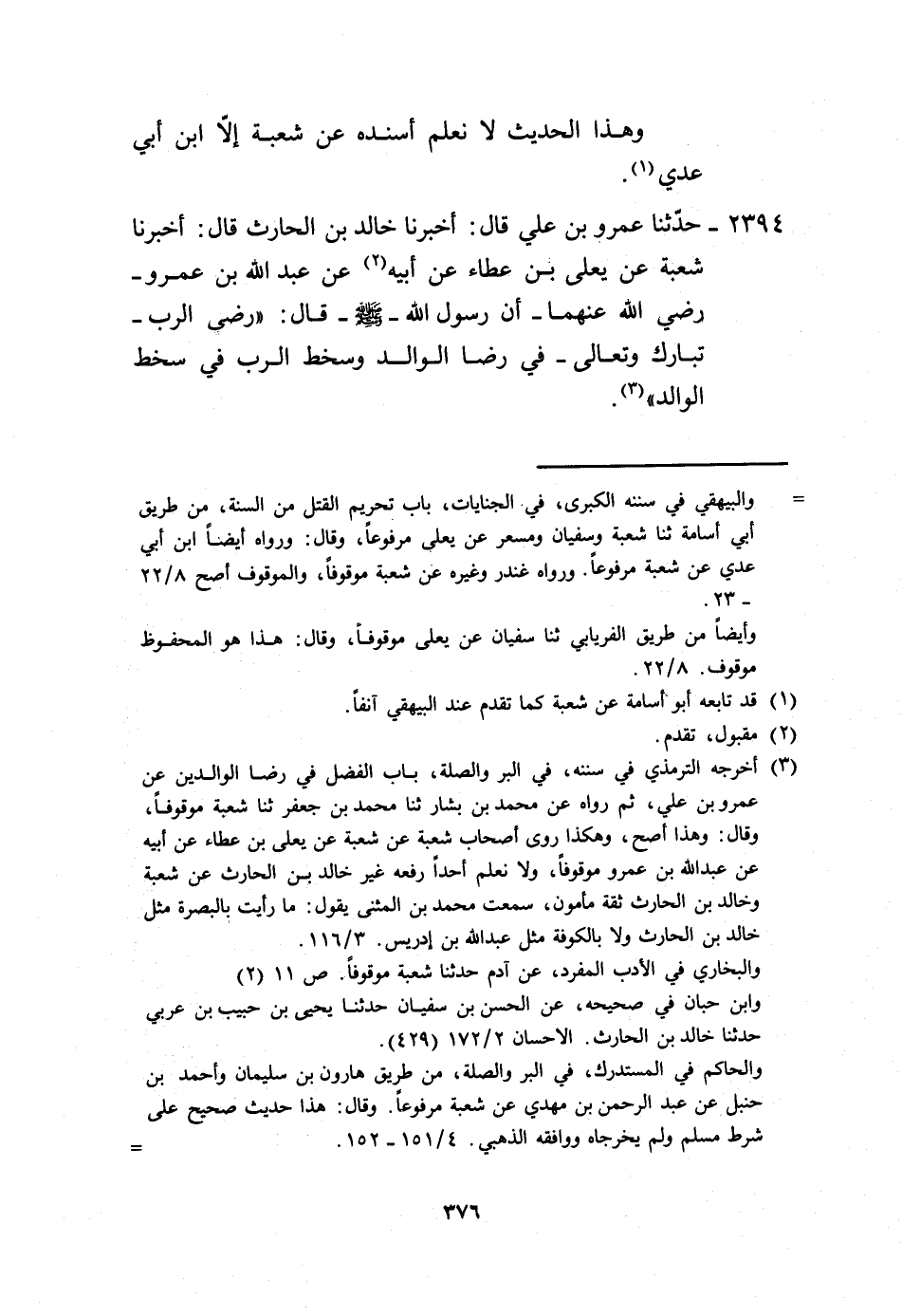 2394 - حَدَّثَنَا عَمْرُو بْنُ عَلِيٍّ، قَالَ: أَخْبَرَنَا خَالِدُ بْنُ الْحَارِثِ، قَالَ: أَخْبَرَنَا شُعْبَةُ، عَنْ يَعْلَى بْنِ عَطَاءٍ، عَنْ أَبِيهِ، عَنْ عَبْدِ اللَّهِ بْنِ عَمْرٍو رَضِيَ اللَّهُ عَنْهُمَا، أَنَّ رَسُولَ اللَّهِ صَلَّى اللهُ عَلَيْهِ وَسَلَّمَ قَالَ: «§رِضَى الرَّبِّ تَبَارَكَ وَتَعَالَى فِي رِضَى الْوَالِدِ، وَسَخَطُ الرَّبِّ فِي سَخَطِ الْوَالِدِ» -[377]-. وَهَذَا الْحَدِيثُ لَا نَعْلَمُ أَحَدًا أَسْنَدَهُ إِلَّا خَالِدُ بْنُ الْحَارِثِ، عَنْ شُعْبَةَ، وَسَمِعْتُ بَعْضَ أَصْحَابِنَا يَذْكُرُهُ عَنْ سَهْلِ بْنِ حَمَّادٍ، عَنْ شُعْبَةَ مَرْفُوعًا وَأَنْكَرْتُهُ عَلَيْهِ