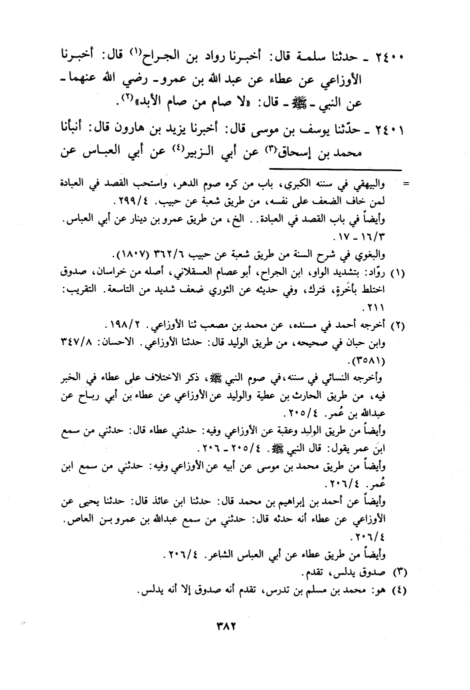 2400 - حَدَّثَنَا سَلَمَةُ، قَالَ: أَخْبَرَنَا رَوَّادُ بْنُ الْجَرَّاحِ، قَالَ: أَخْبَرَنَا الْأَوْزَاعِيُّ، عَنْ عَطَاءٍ، عَنْ عَبْدِ اللَّهِ بْنِ عَمْرٍو رَضِيَ اللَّهُ عَنْهُمَا، عَنِ النَّبِيِّ صَلَّى اللهُ عَلَيْهِ وَسَلَّمَ قَالَ: «§لَا صَامَ مَنْ صَامَ الْأَبَدَ»