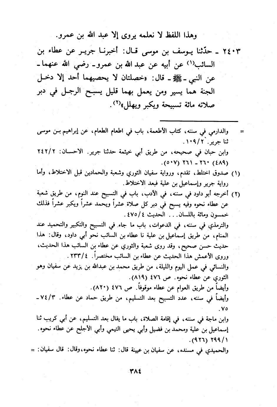 2403 - حَدَّثَنَا يُوسُفُ بْنُ مُوسَى، قَالَ: أَخْبَرَنَا جَرِيرٌ، عَنْ عَطَاءِ بْنِ السَّائِبِ، عَنْ أَبِيهِ، عَنْ عَبْدِ اللَّهِ بْنِ عَمْرٍو رَضِيَ اللَّهُ عَنْهُمَا، عَنِ النَّبِيِّ صَلَّى اللهُ عَلَيْهِ وَسَلَّمَ قَالَ: «§خَصْلَتَانِ لَا يُحْصِيهِمَا أَحَدٌ إِلَّا دَخَلَ الْجَنَّةَ، هُمَا يَسِيرٌ وَمَنْ يَعْمَلْ بِهِمَا قَلِيلٌ، يُسَبِّحُ الرَّجُلُ فِي دُبُرِ صَلَاتِهِ مِائَةَ تَسْبِيحَةٍ وَيُكَبِّرُ وَيُهَلِّلُ»